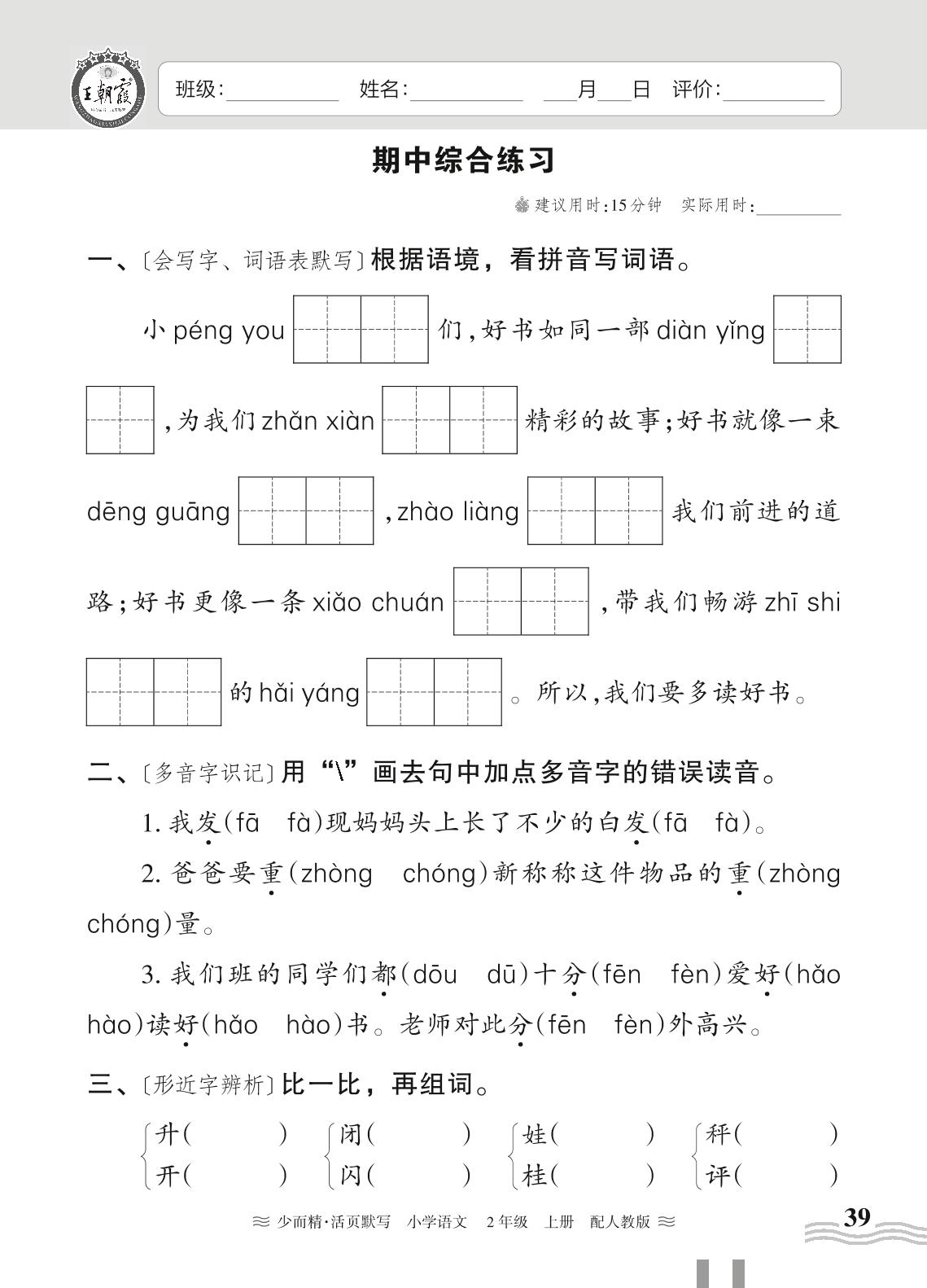 2023上册二年级语文人教版 期中综合练习(默写专练)