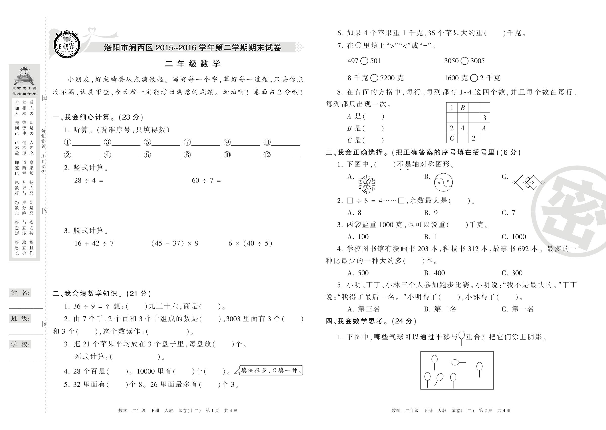 2015-2016学年第二学期洛阳市涧西区二年级数学试卷(人教版)【12】