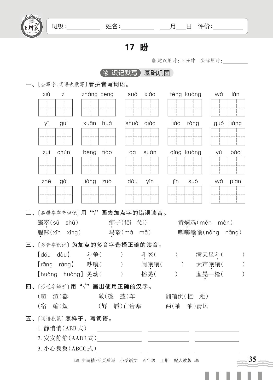 2023上册六年级语文人教版 第五单元——17 盼