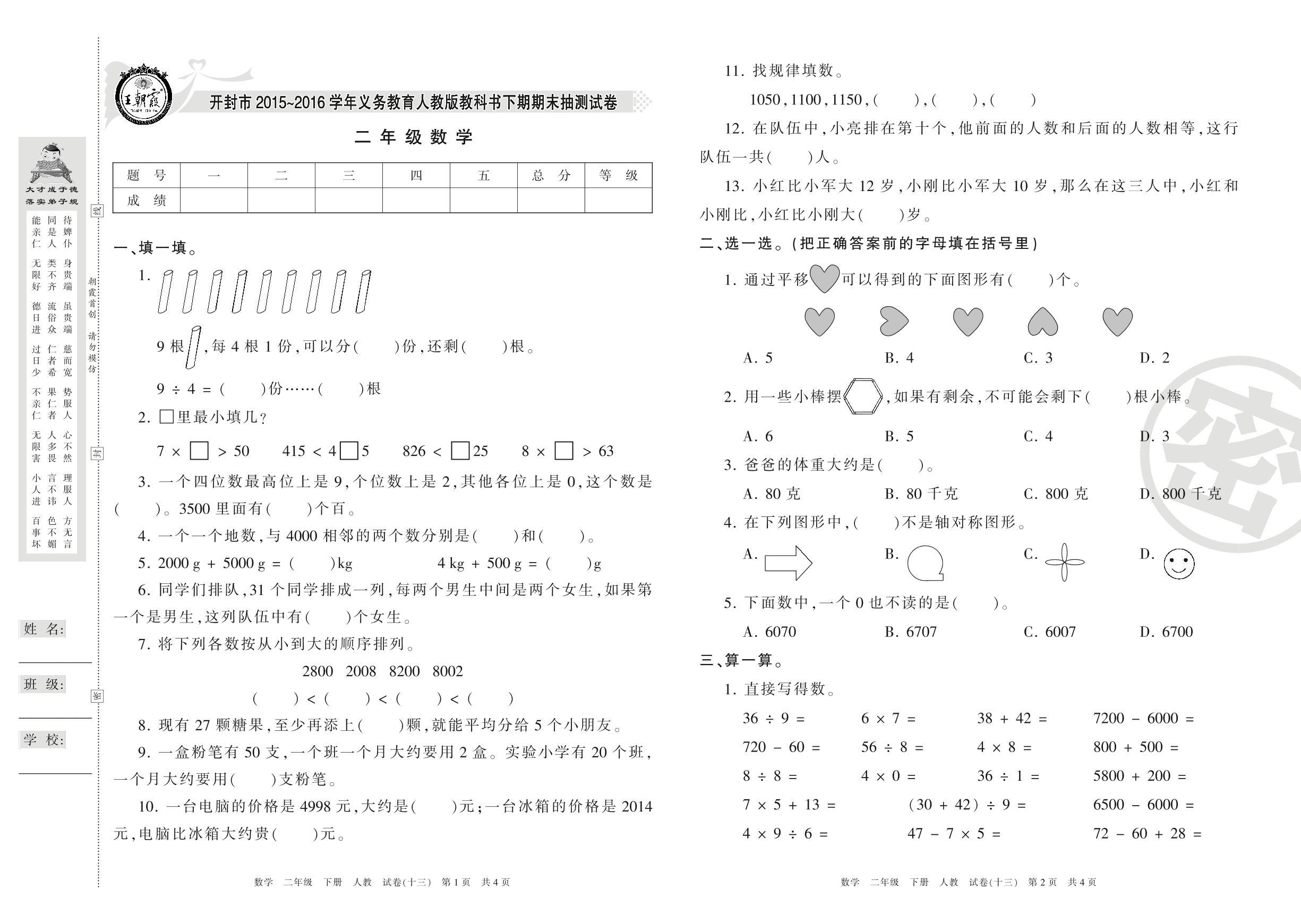2015-2016学年第二学期开封市二年级数学试卷(人教版)【13】