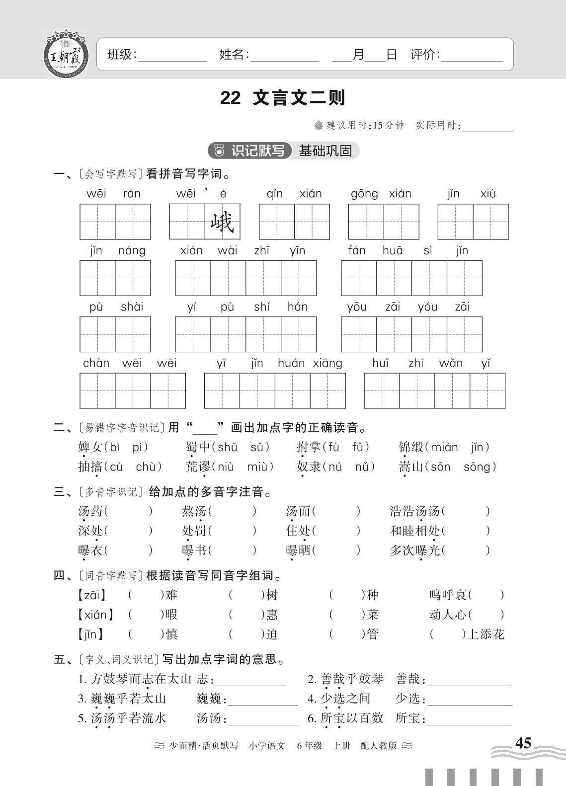 2023上册六年级语文人教版 第七单元——22 文言文二则