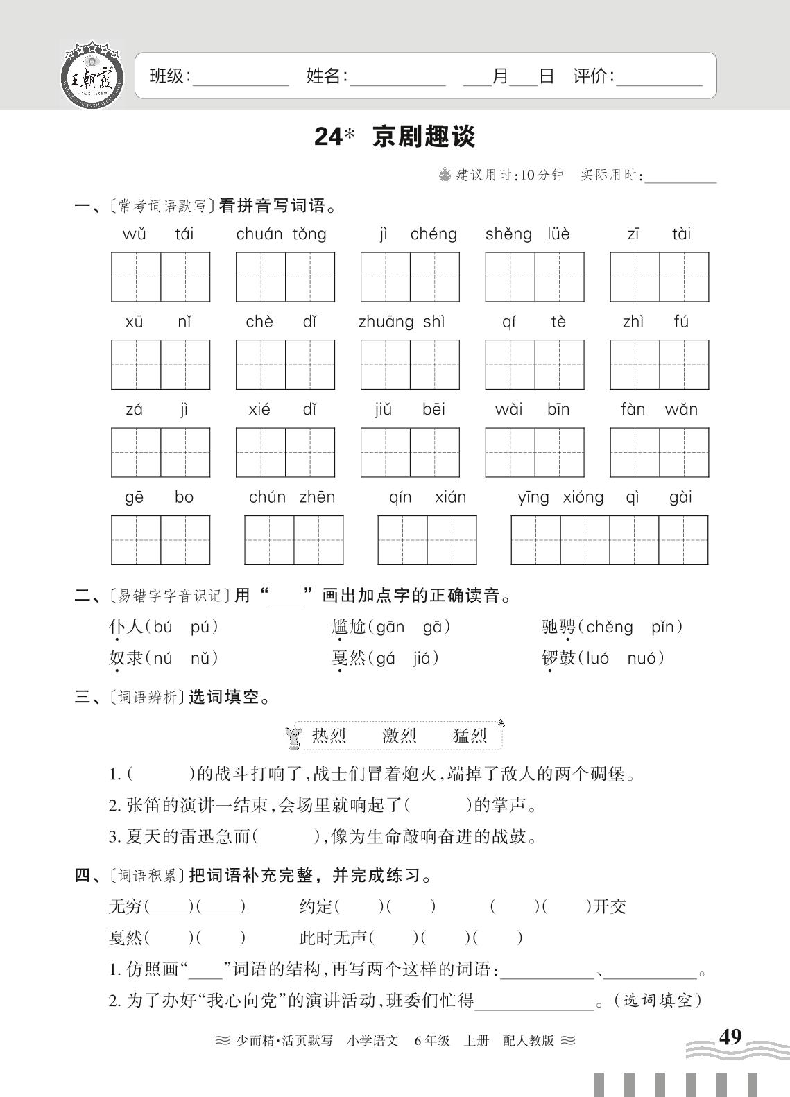 2023上册六年级语文人教版 第七单元——24 京剧趣谈