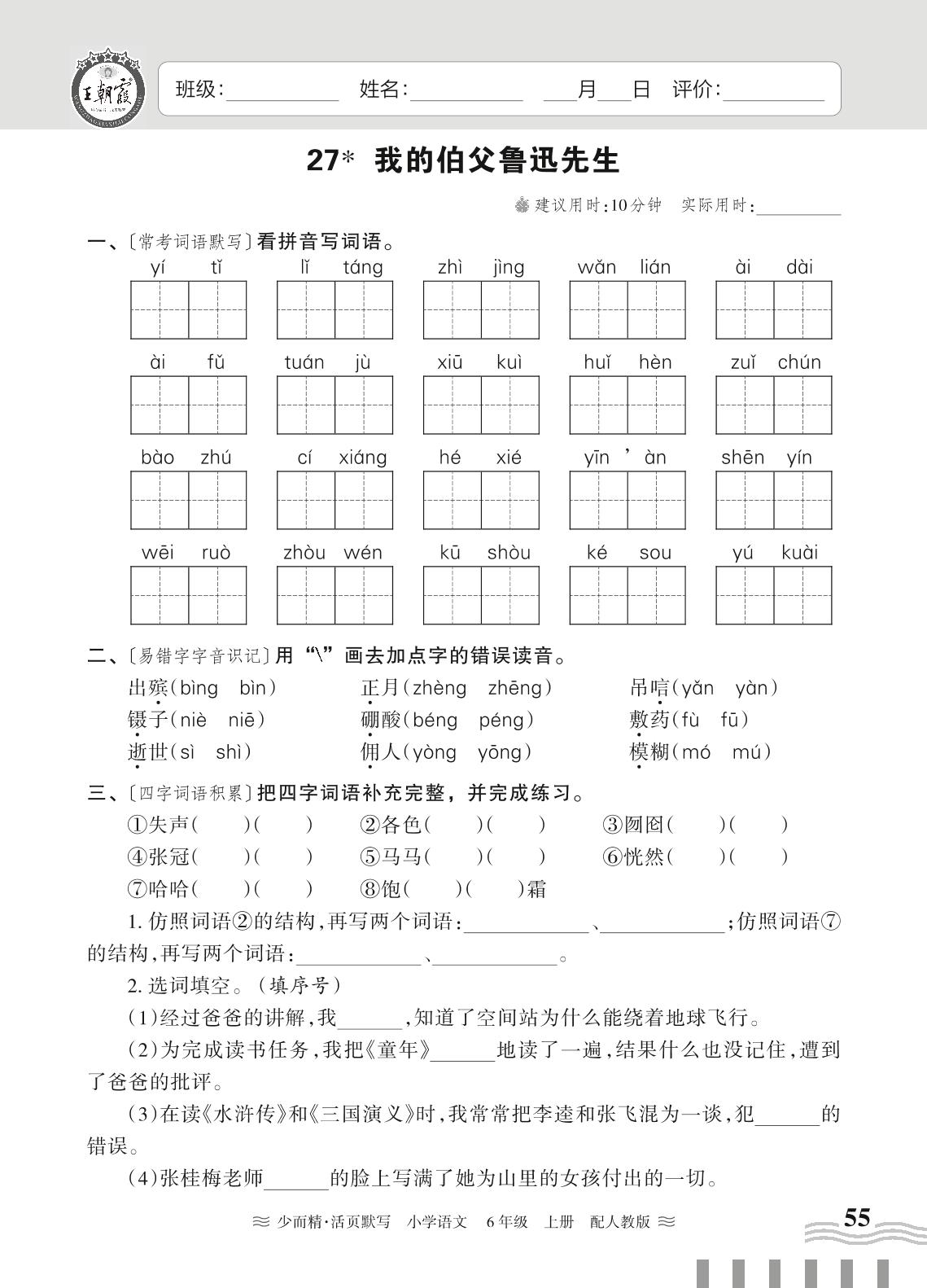 2023上册六年级语文人教版 第八单元——27 我的伯父鲁迅先生