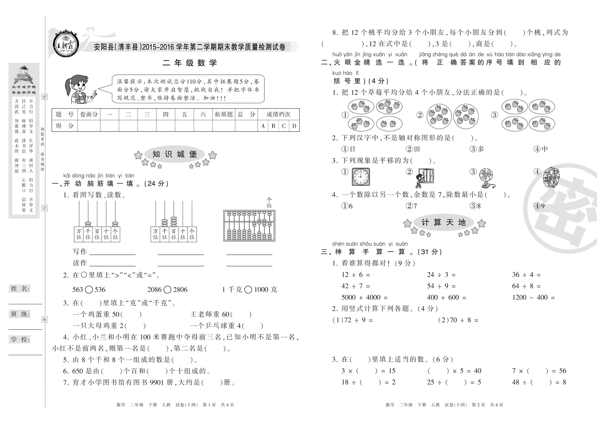 2015-2016学年第二学期安阳市安阳县(清丰县)二年级数学试卷(人教版)【14】