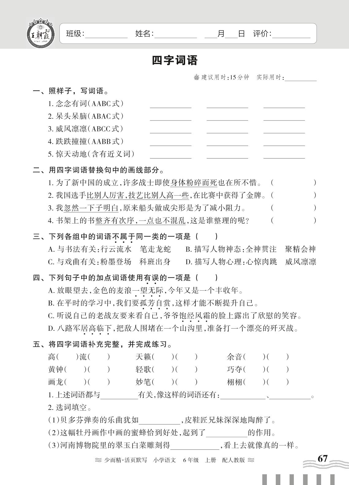 2023上册六年级语文人教版 期末专项练习——四字词语