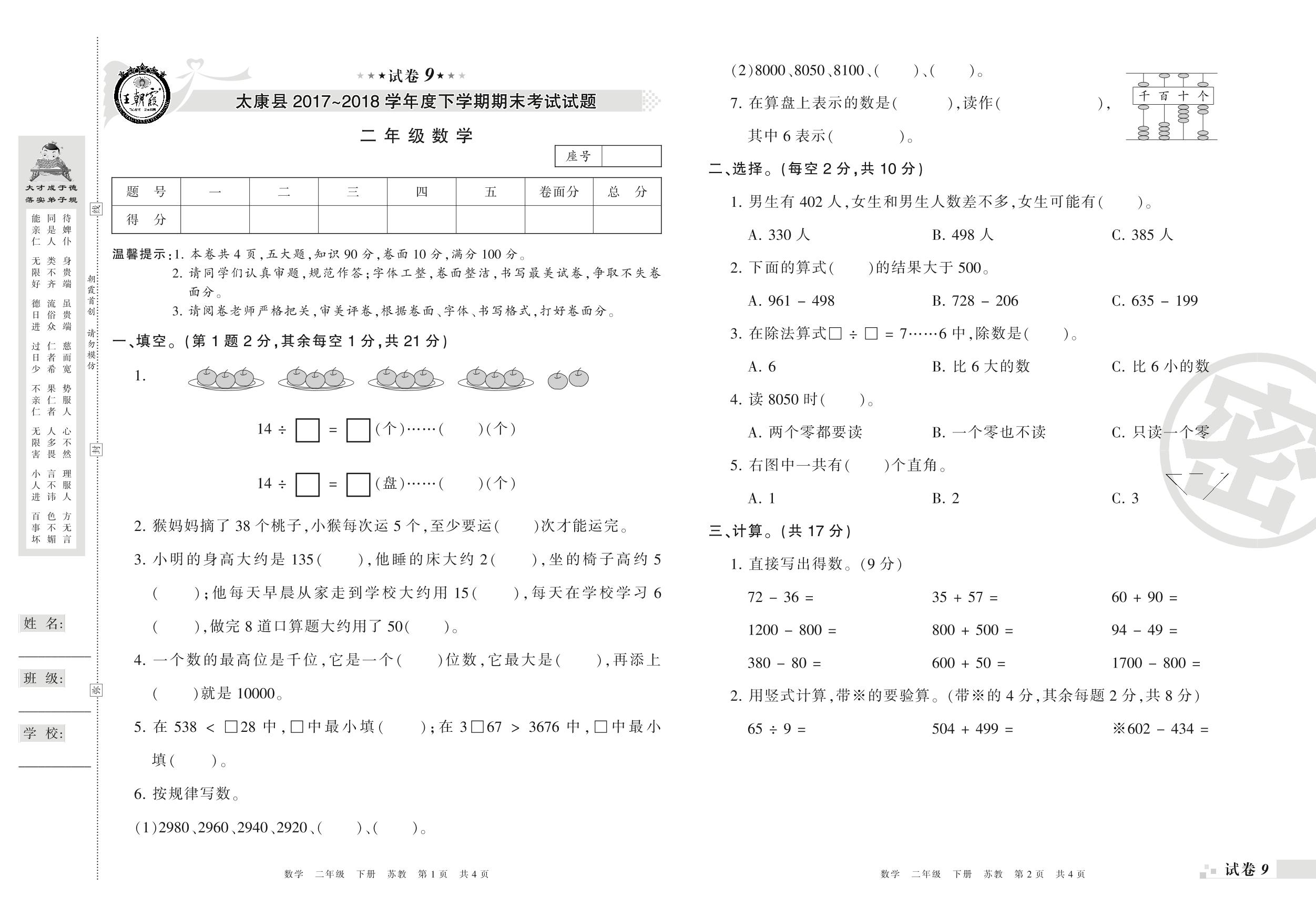 2017-2018学年第二学期周口市太康县二年级数学试卷(苏教版)【9】