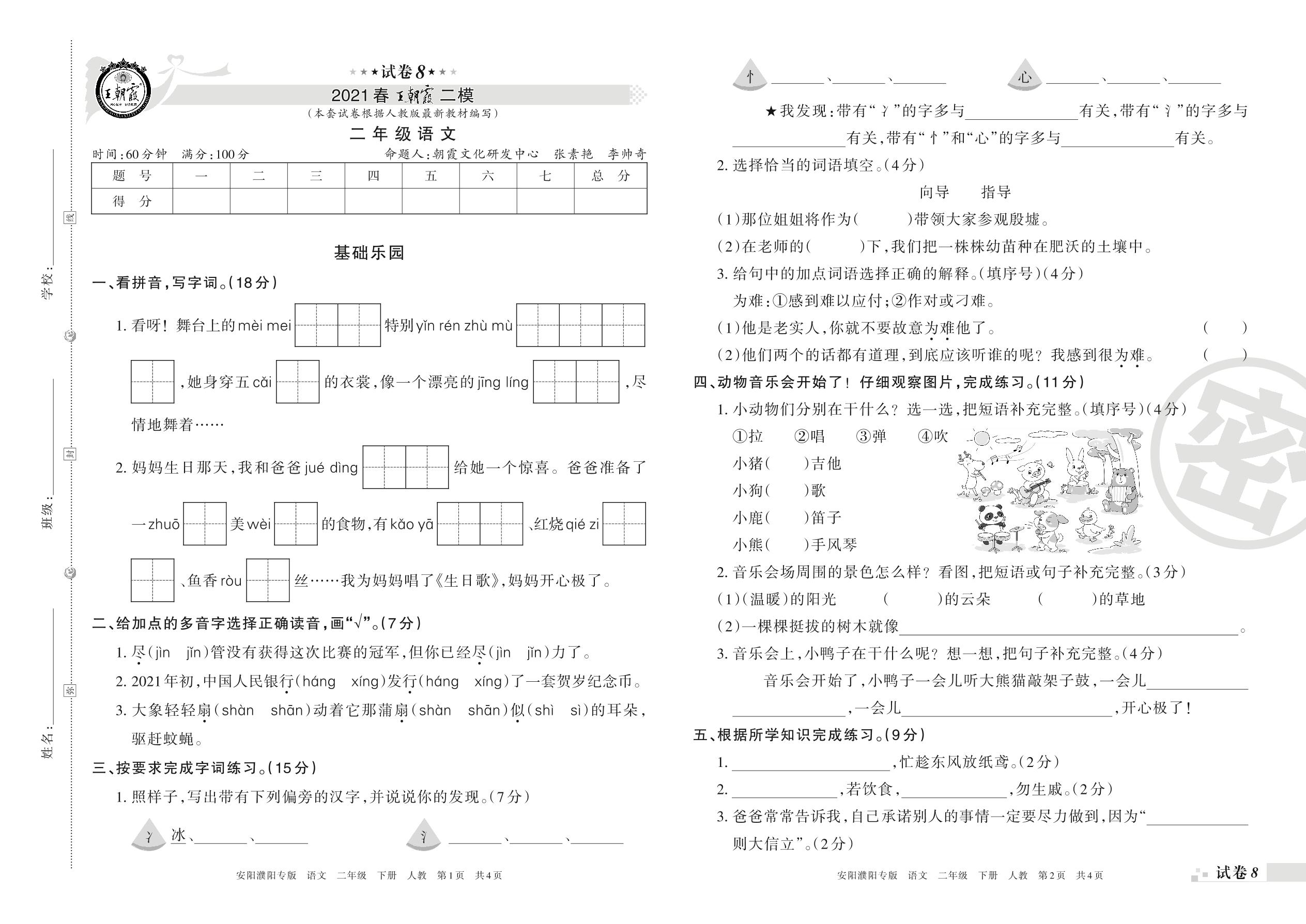 王朝霞期末模拟卷二年级下册语文(人教版)_R21080163243【8】