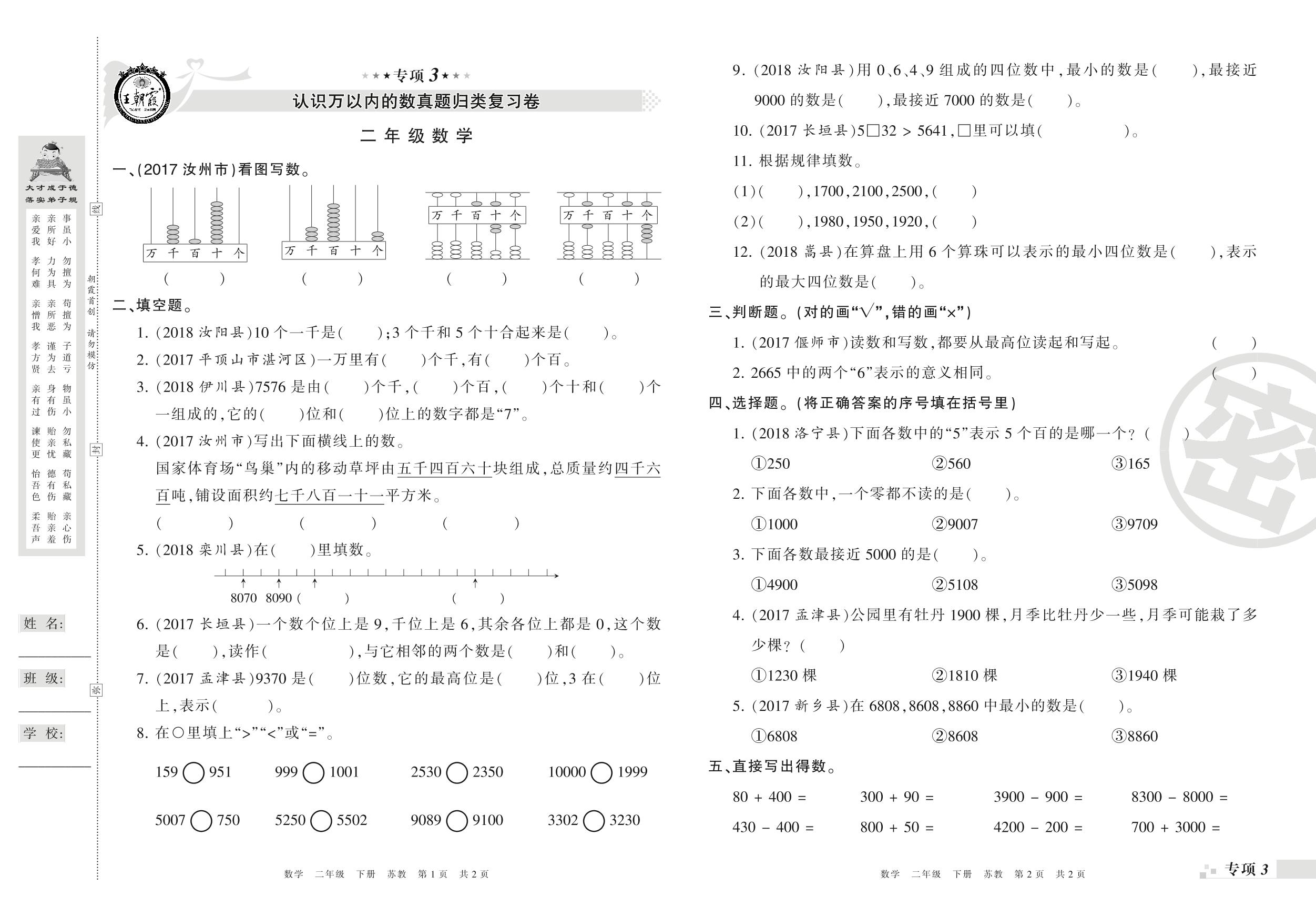 王朝霞期末专项卷——认识万以内的数 两、三位数的加法和减法(一)真题归类复习卷二年级下册数学(苏教版)_R21080394812【0】