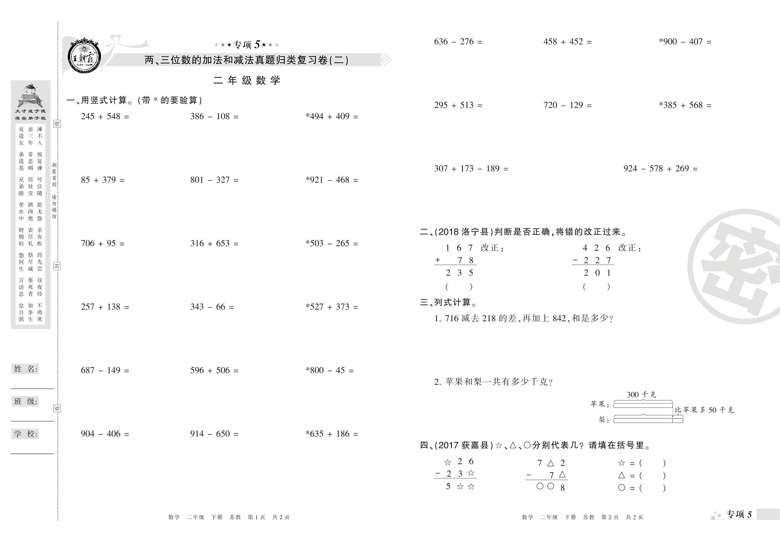 王朝霞期末专项卷——两、三位数的加法和减法(二)(三)真题归类复习卷二年级下册数学(苏教版)_R21080394815【0】