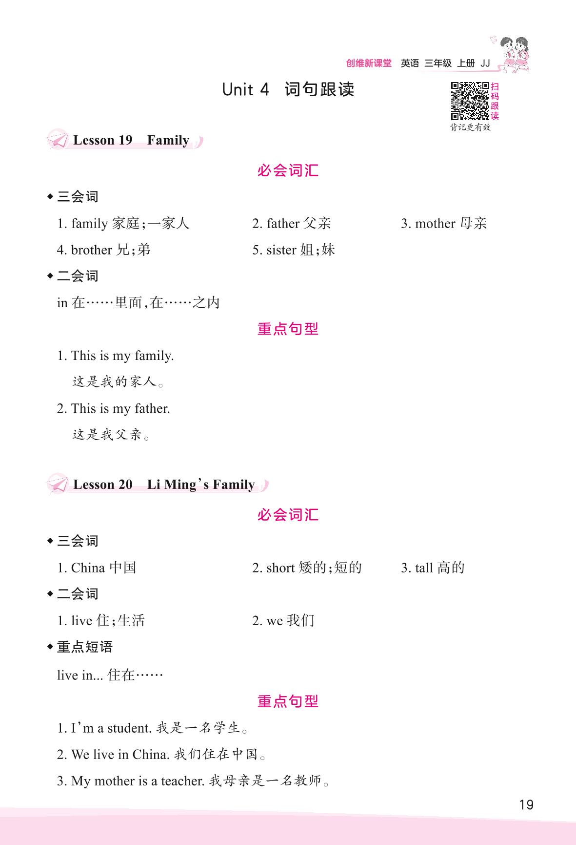 2023上册三年级英语冀教版 Unit 4 Family—词句跟读