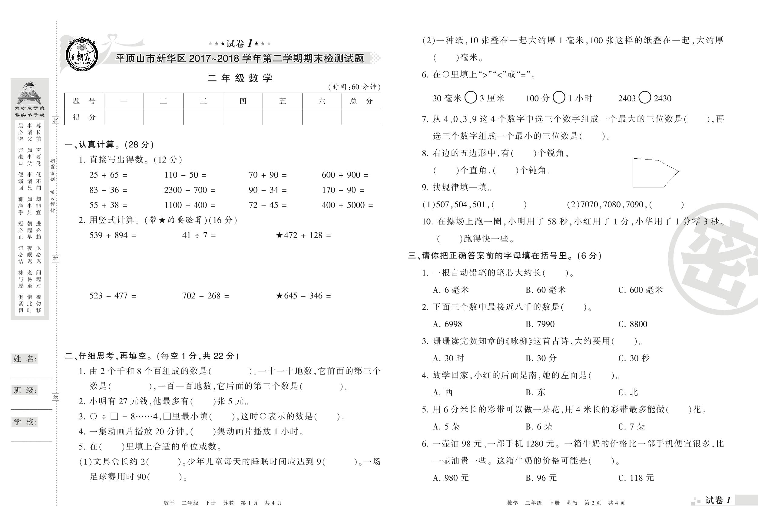 2017-2018学年第二学期平顶山市新华区二年级数学试卷(苏教版)_R21080394821【1】