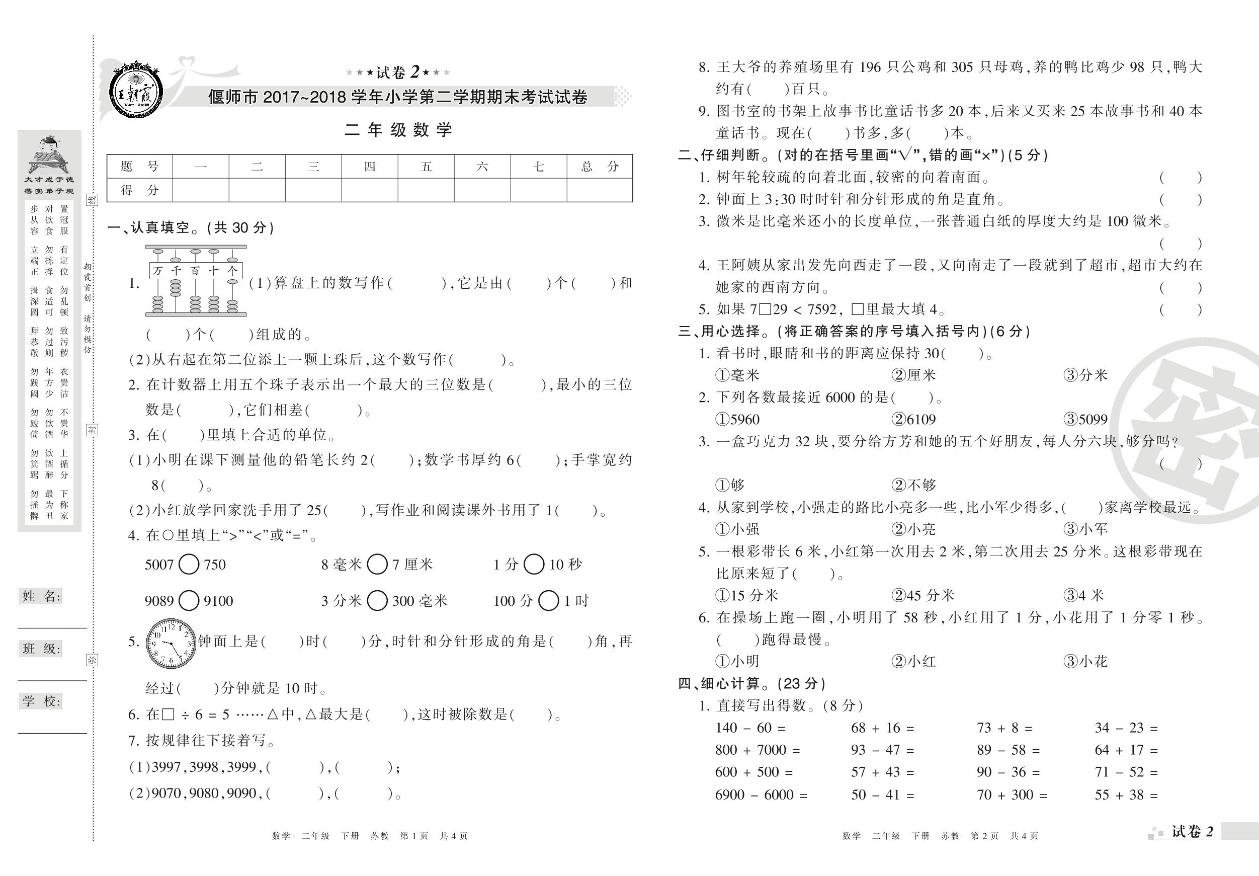 2017-2018学年第二学期偃师市二年级数学试卷(苏教版)【2】