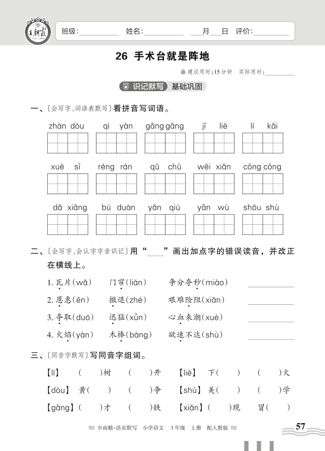 2023上册三年级语文人教版 第八单元——26 手术台就是阵地