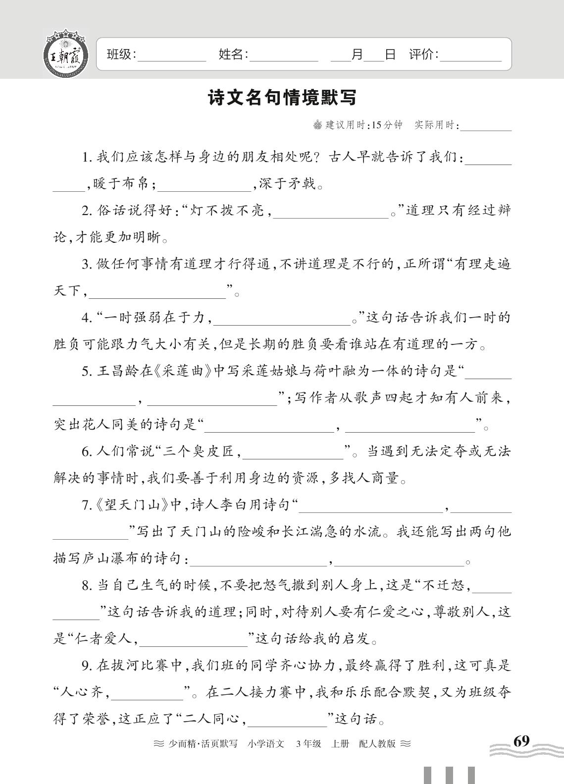 2023上册三年级语文人教版 期末专项练习——诗文名句情境默写