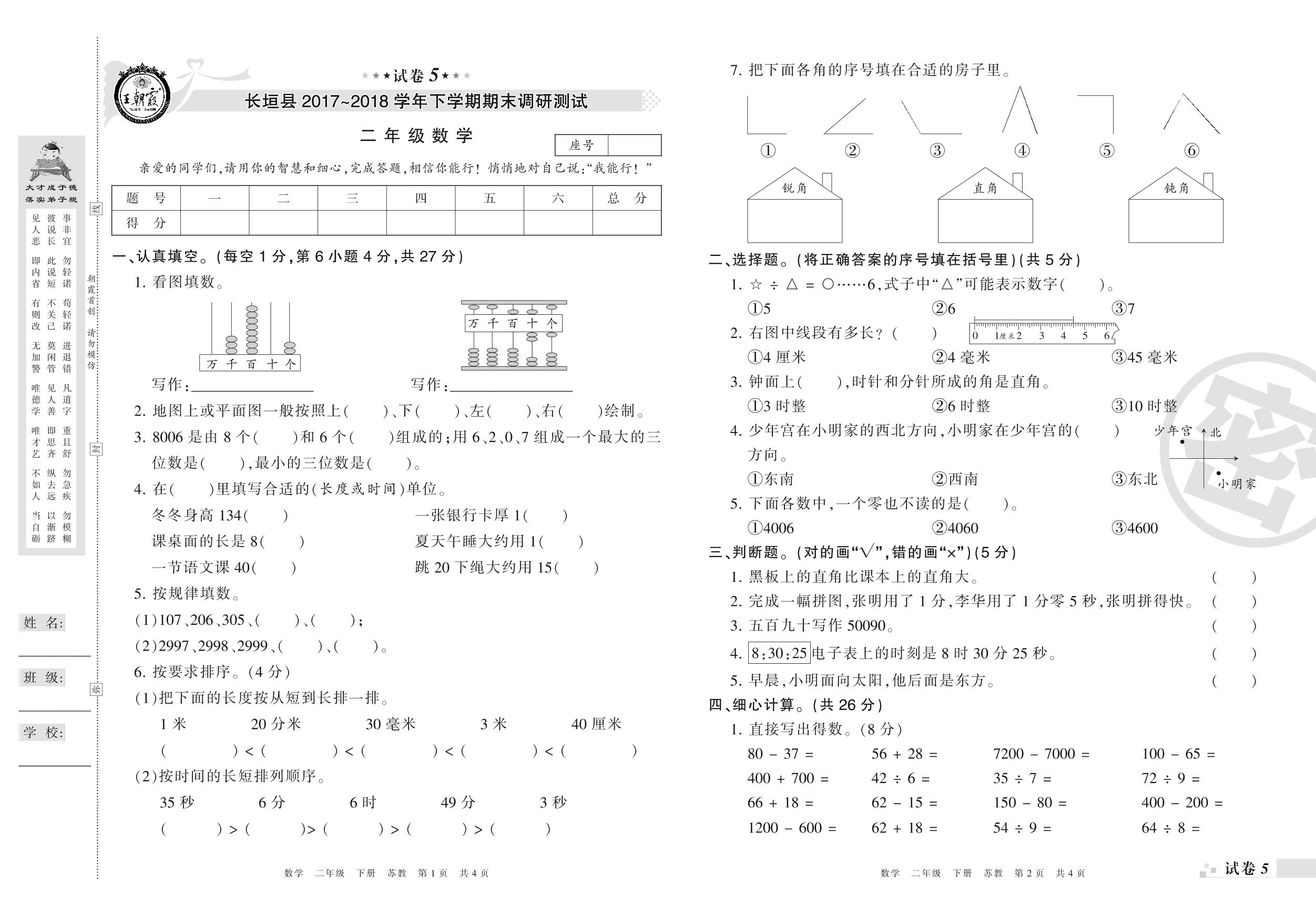 2017-2018学年第二学期新乡市长垣县二年级数学试卷(苏教版)【5】