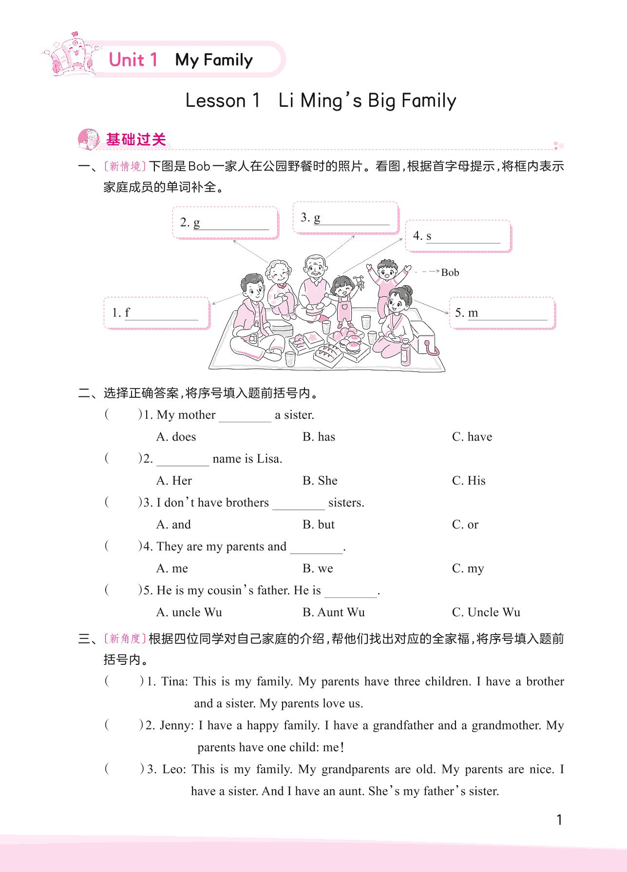 2023上册五年级英语冀教版 Unit 1—Lesson 1 Li Ming’s Big Family