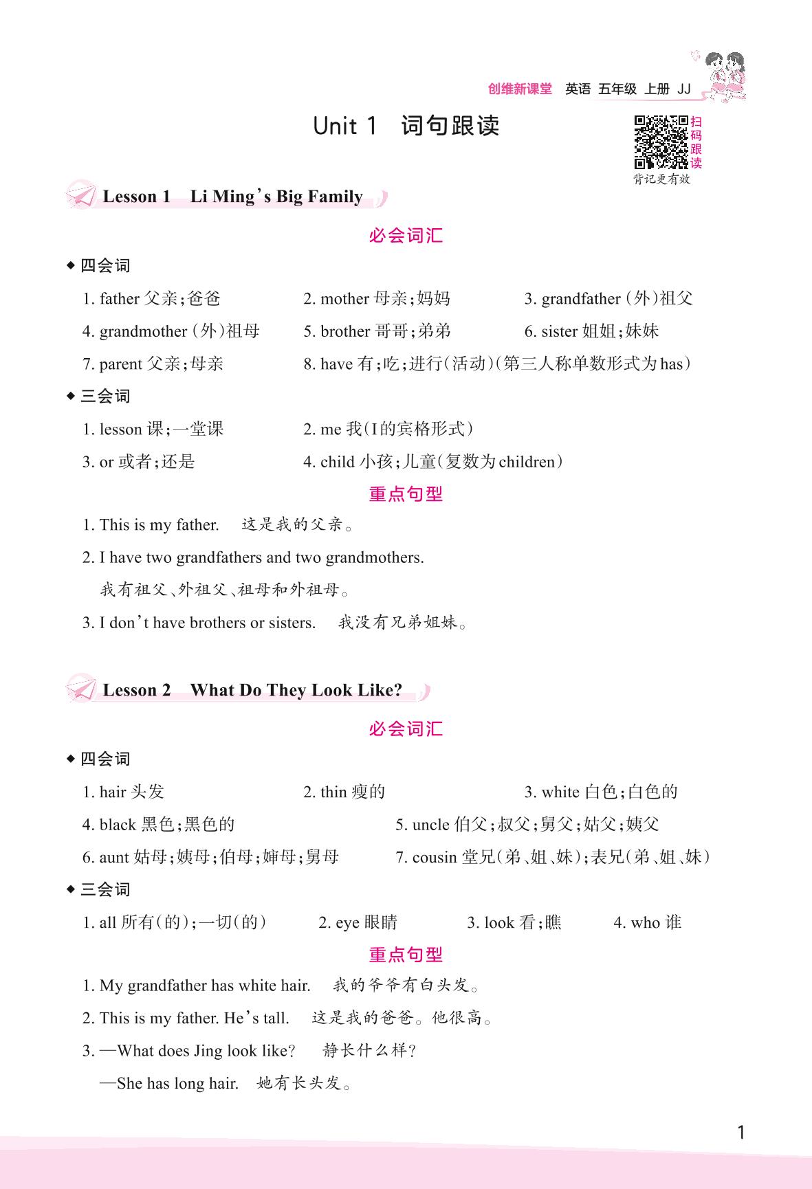 2023上册五年级英语冀教版 Unit 1 My Family—词句跟读