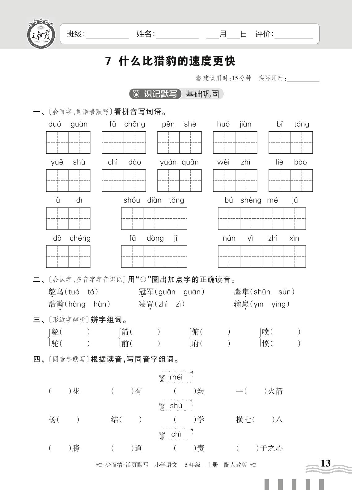 2023上册五年级语文人教版 第二单元——7 什么比猎豹的速度更快