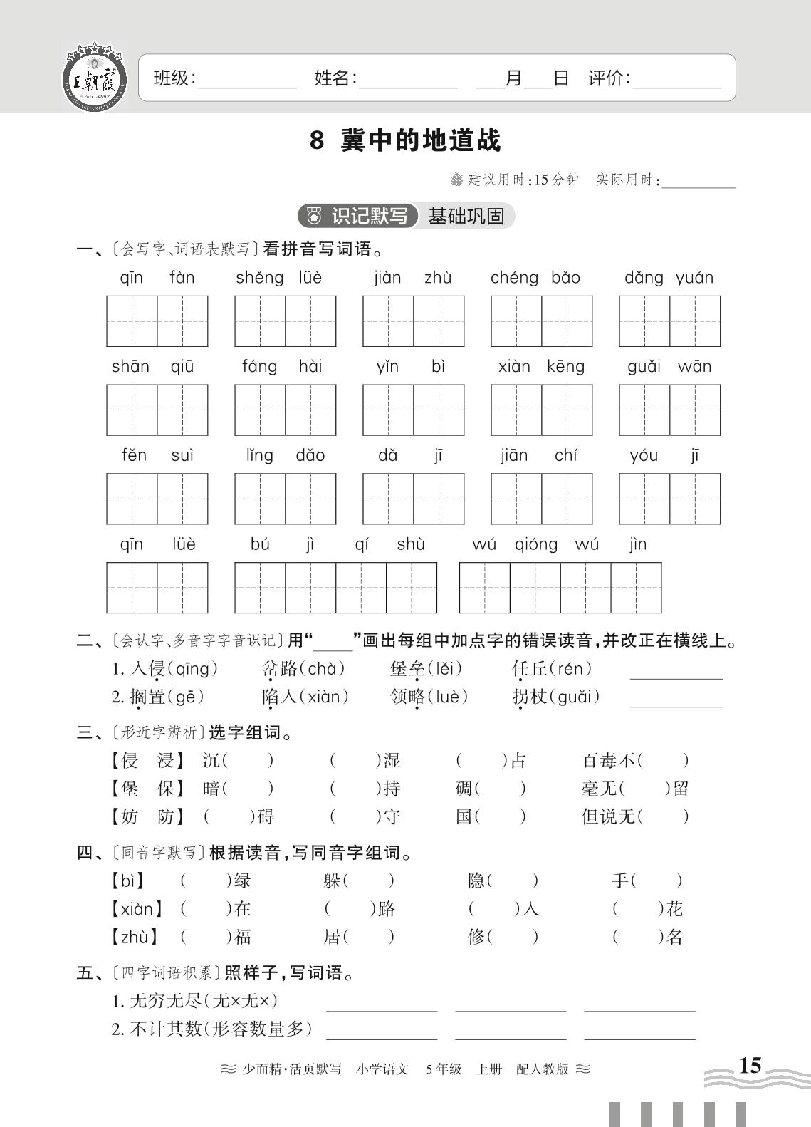 2023上册五年级语文人教版 第二单元——8 冀中的地道战