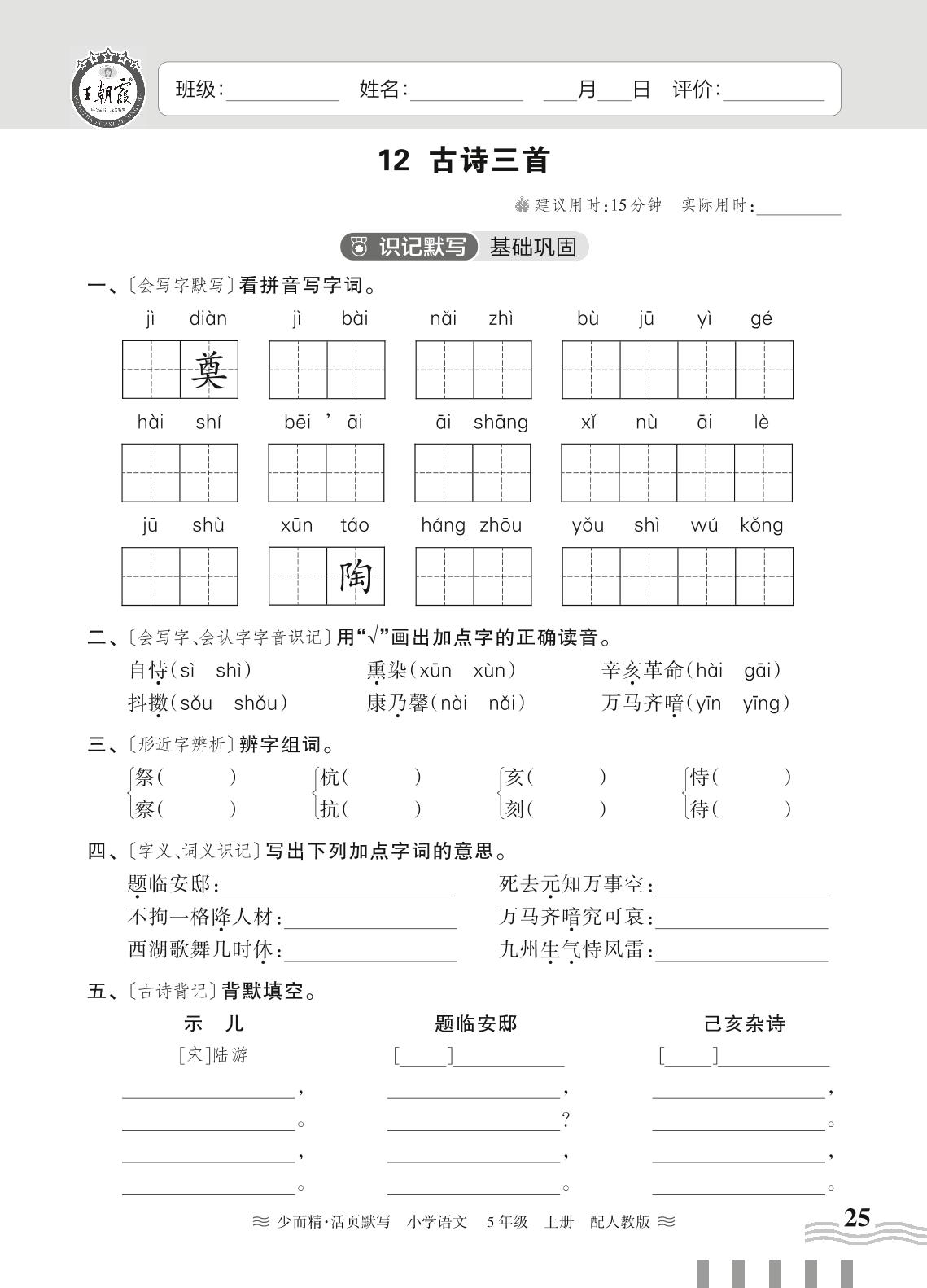 2023上册五年级语文人教版 第四单元——12 古诗三首