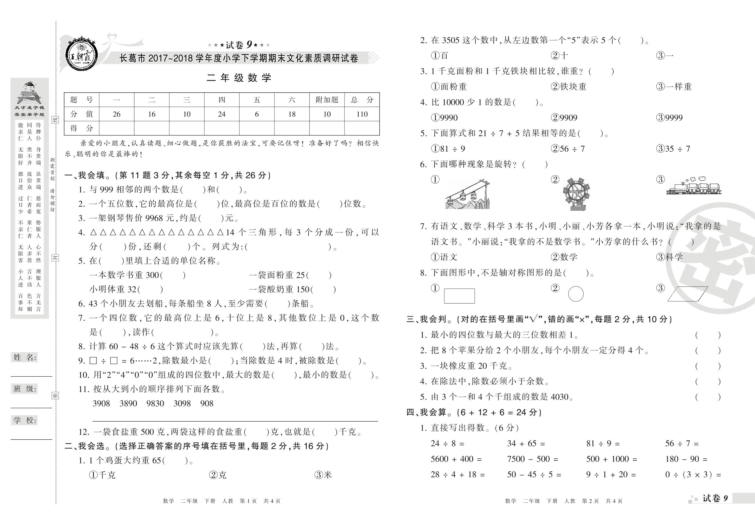 2017-2018学年第二学期长葛市二年级数学试卷(人教版)【9】