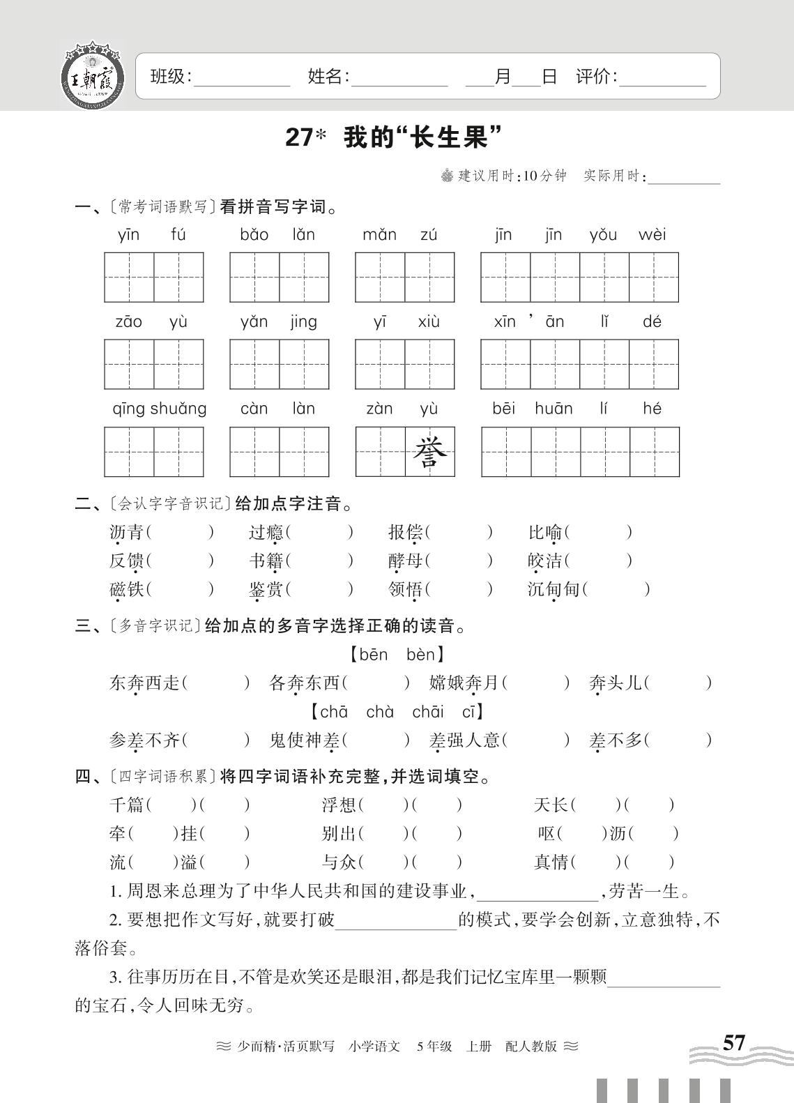 2023上册五年级语文人教版 第八单元——27 我的“长生果”