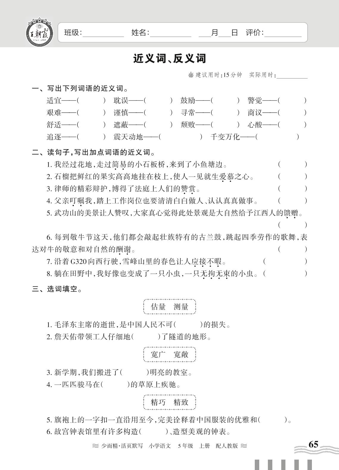 2023上册五年级语文人教版 期末专项练习——近义词、反义词