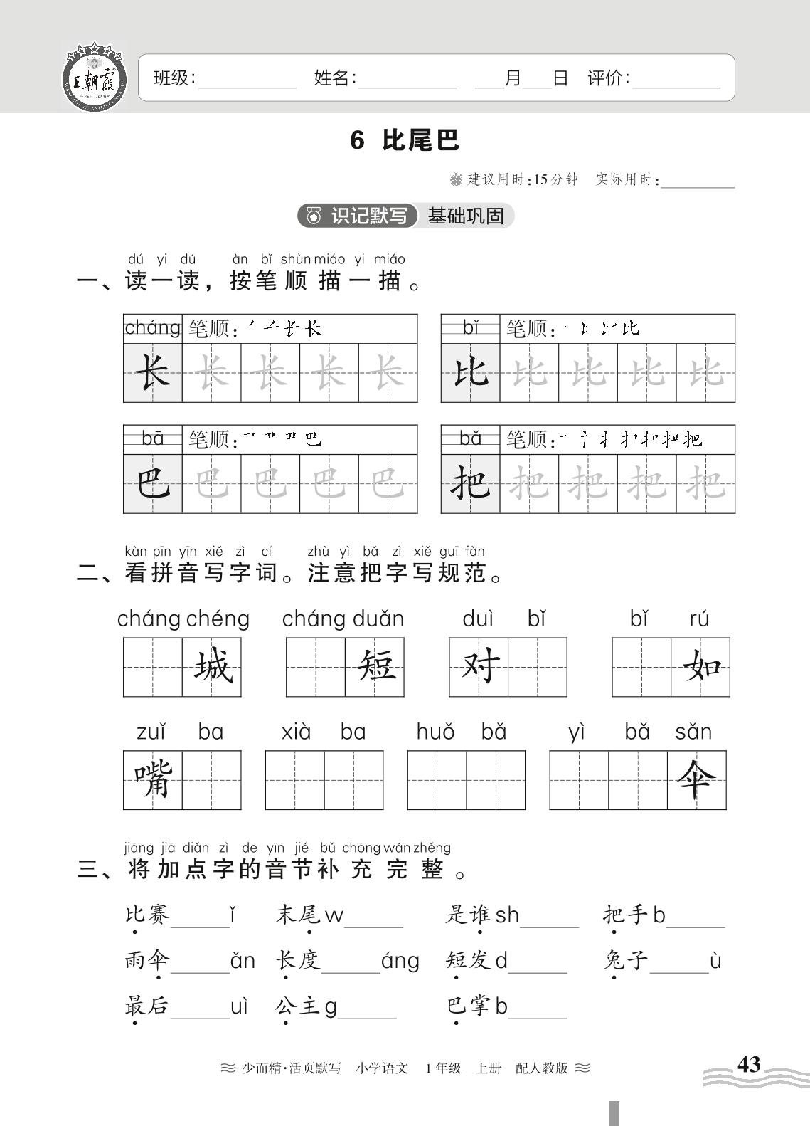 2023上册一年级语文人教版 第六单元——6 比尾巴