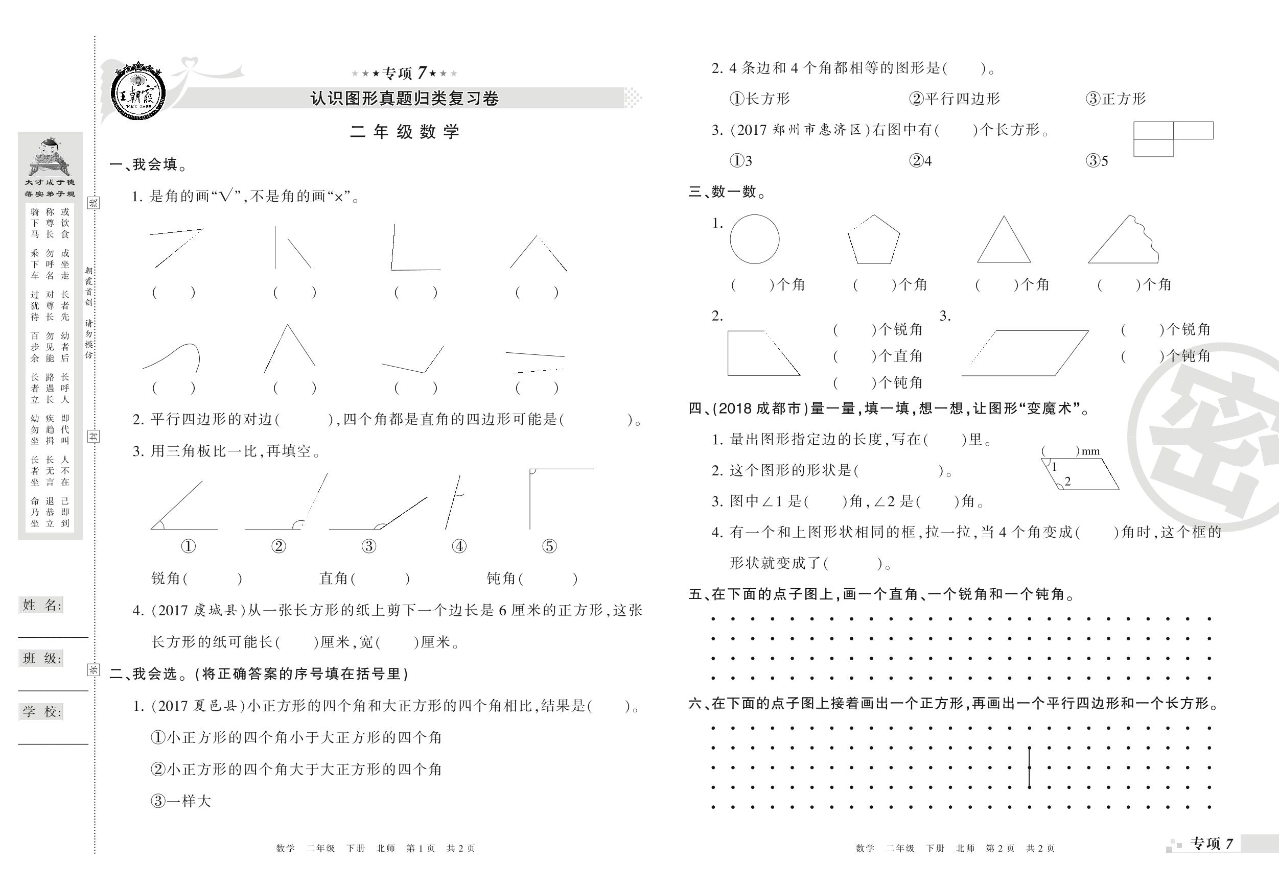 王朝霞期末专项卷——认识图形、调查与记录真题归类复习卷二年级下册数学(北师版)_R21080395011【0】