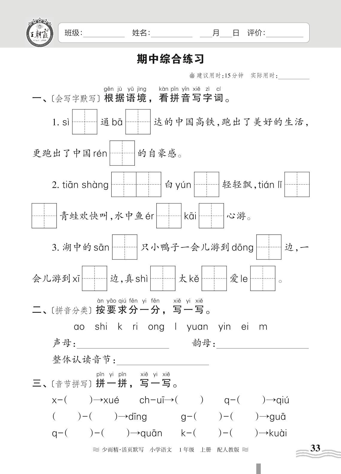 2023上册一年级语文人教版 期中综合练习(默写专练)