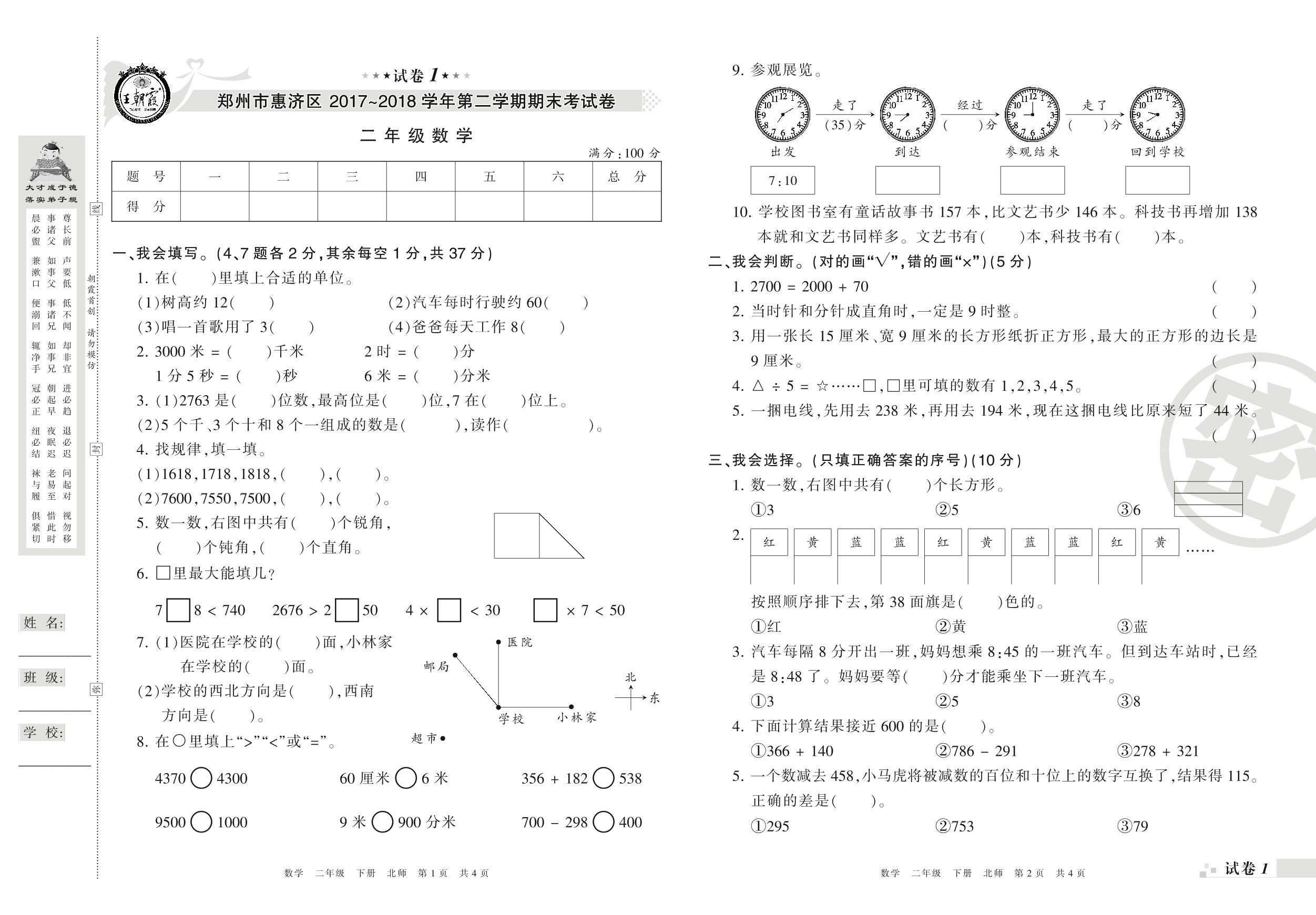 2017-2018学年第二学期郑州市惠济区二年级数学试卷(北师版)【1】