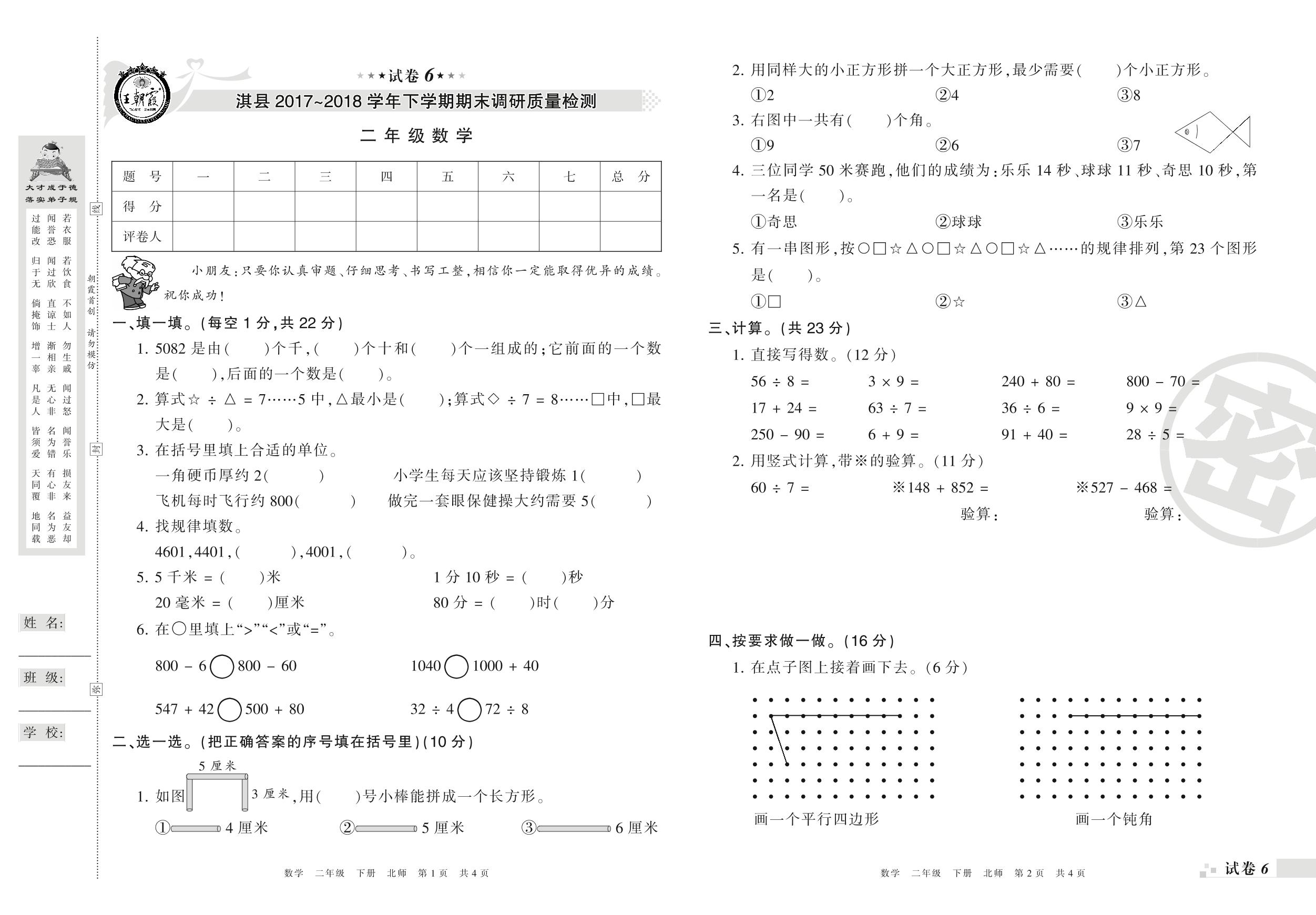 2017-2018学年第二学期鹤壁市淇县二年级数学试卷(北师版)【6】