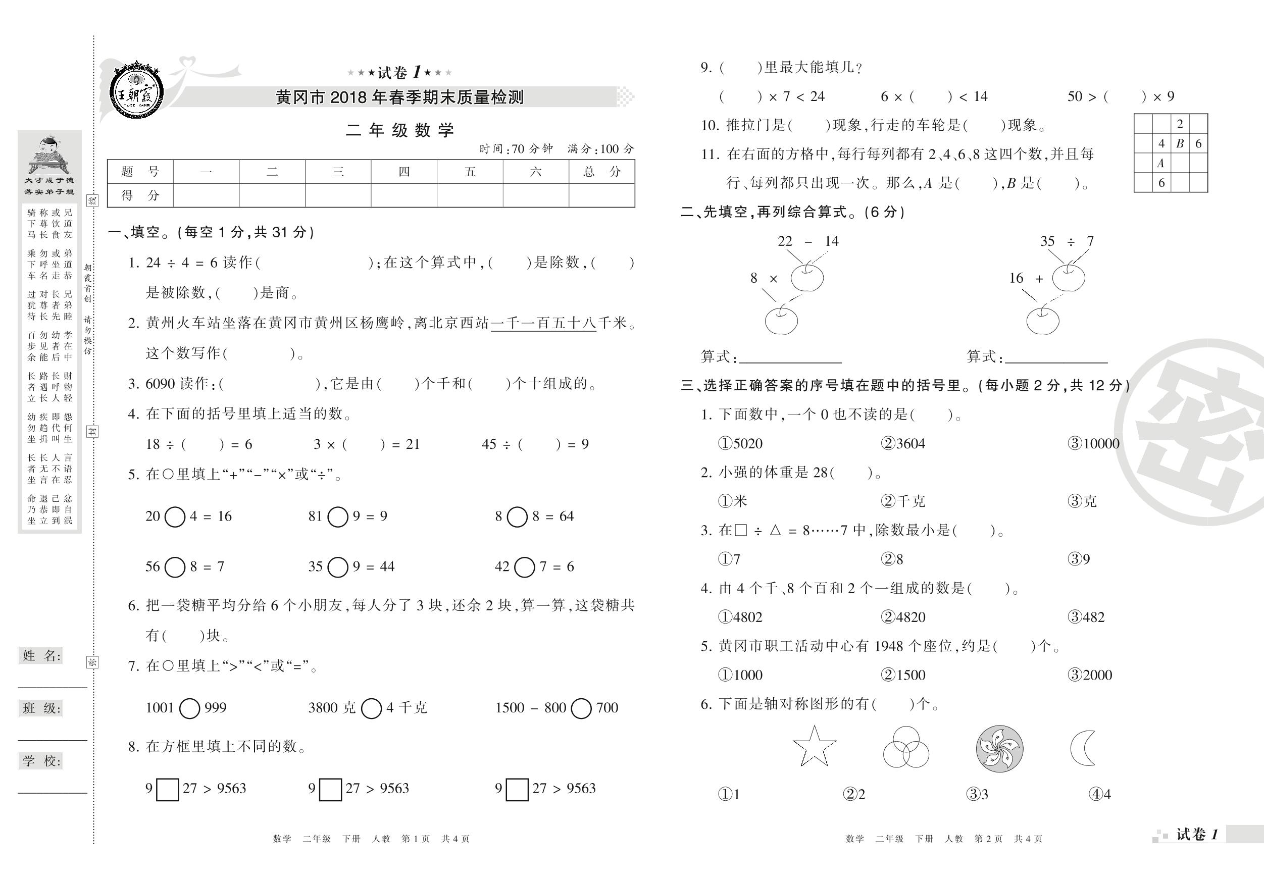 2017-2018学年第二学期黄冈市二年级数学试卷(人教版)【1】