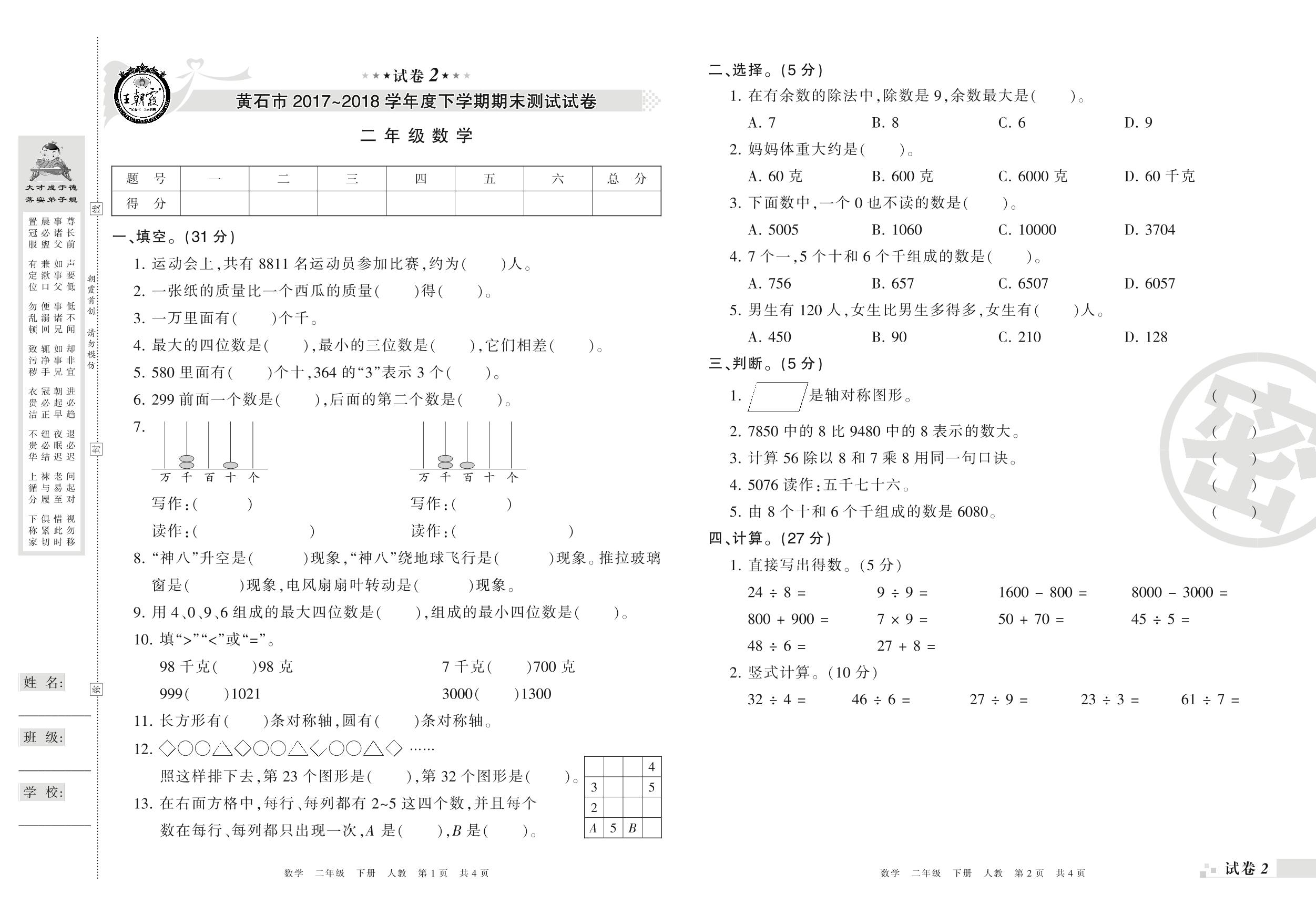 2017-2018学年第二学期黄石市二年级数学试卷(人教版)【2】