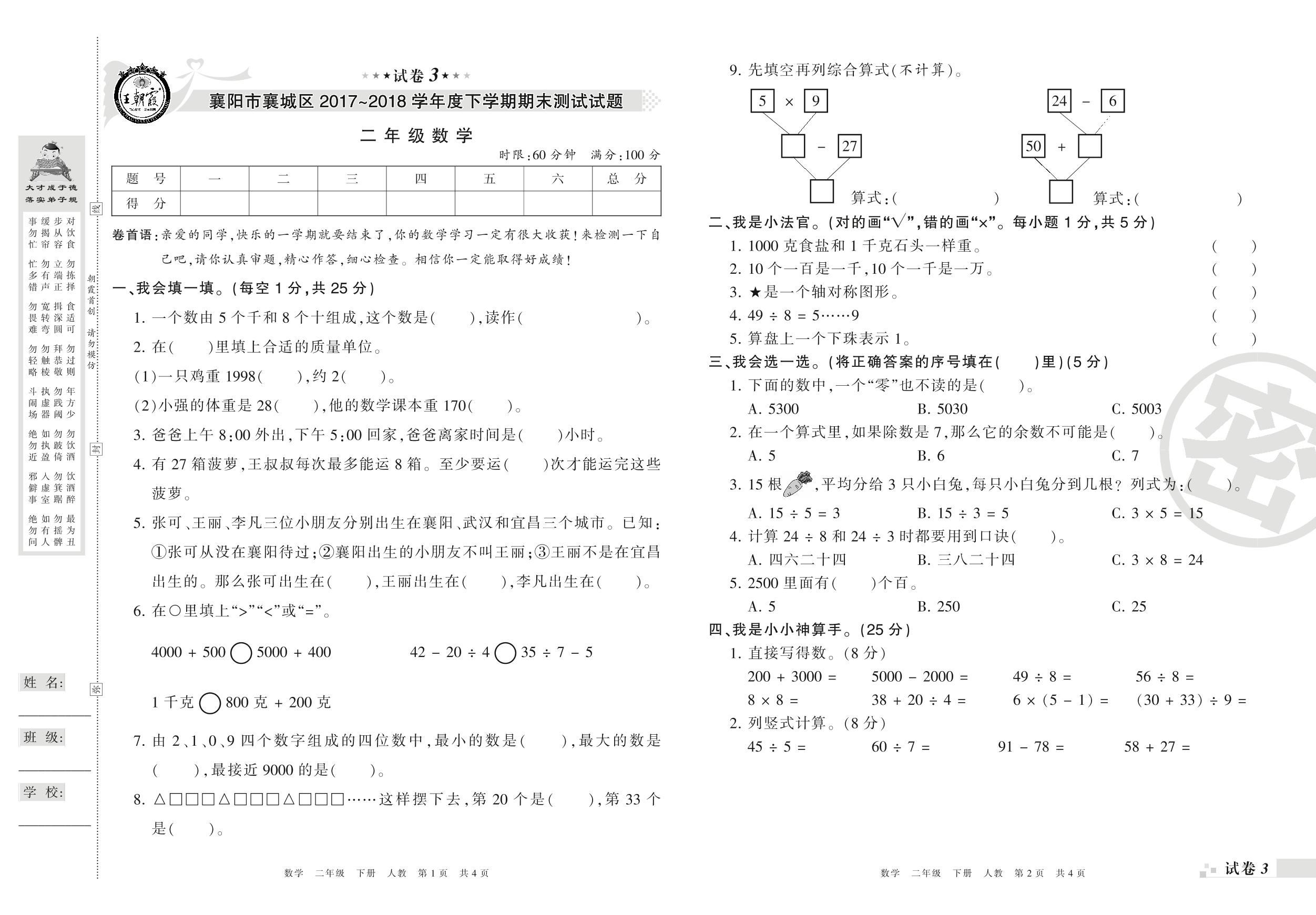 2017-2018学年第二学期襄阳市襄城区二年级数学试卷(人教版)【3】