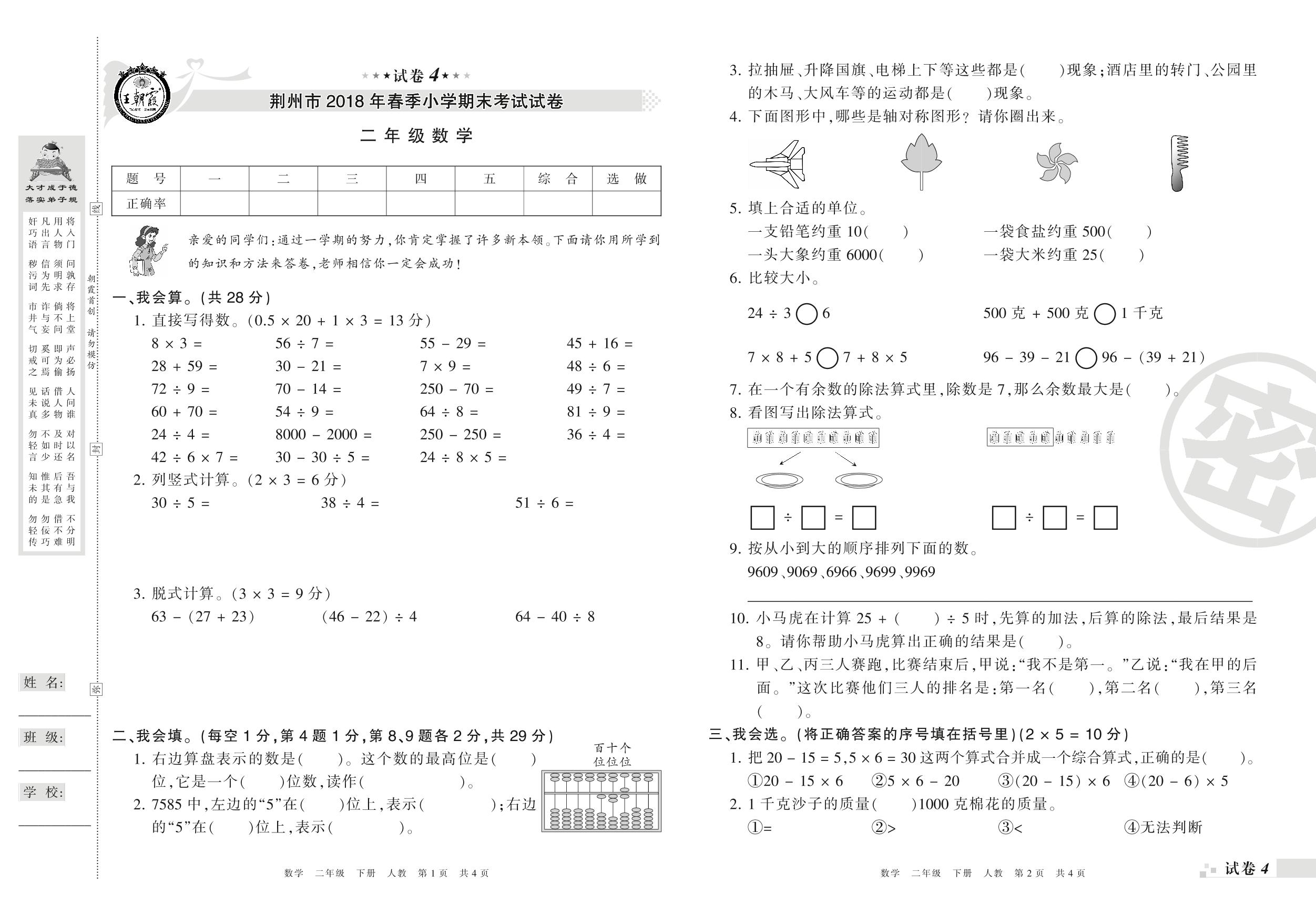 2017-2018学年第二学期荆州市二年级数学试卷(人教版)【4】