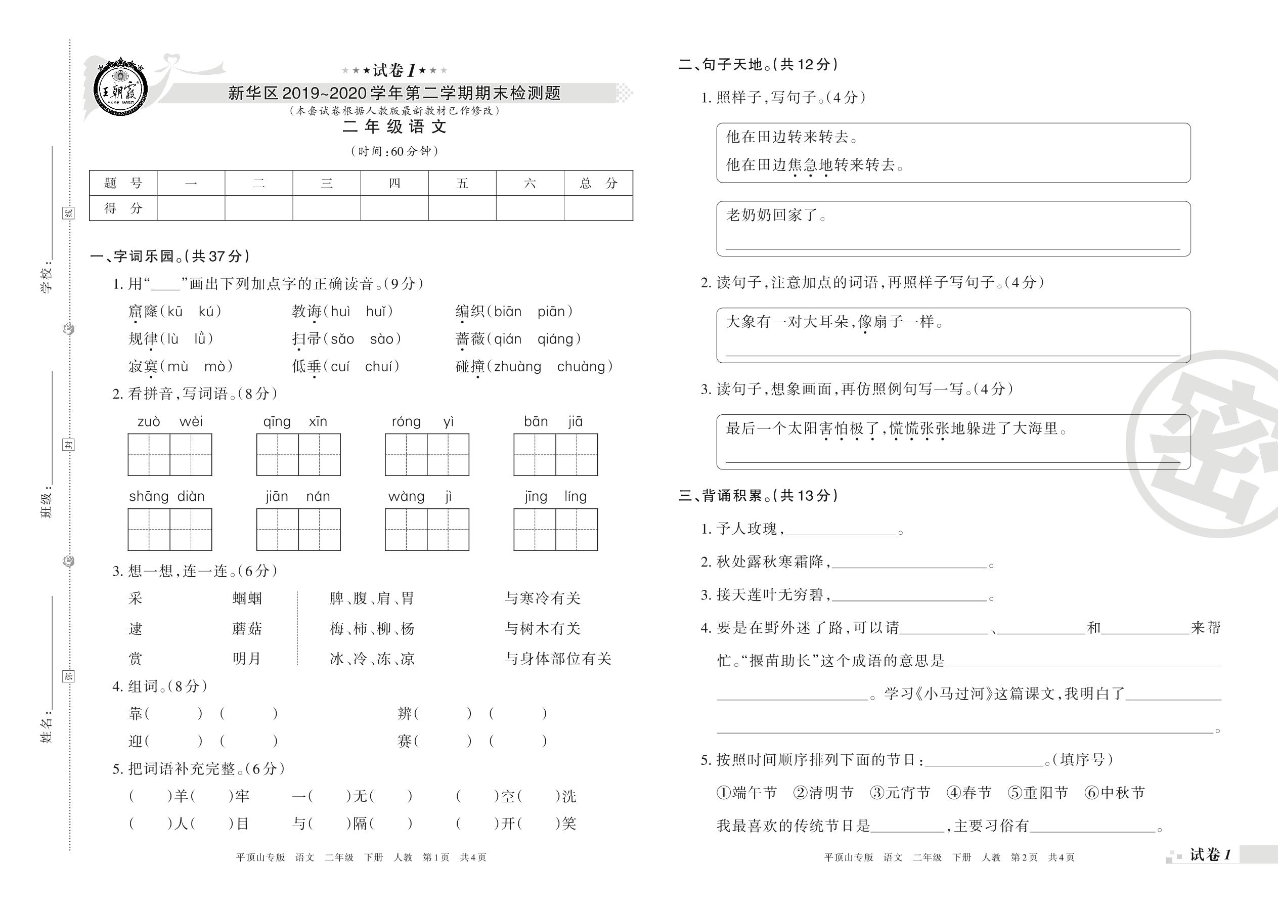 2019-2020学年第二学期平顶山市新华区二年级语文试卷(人教版)【1】