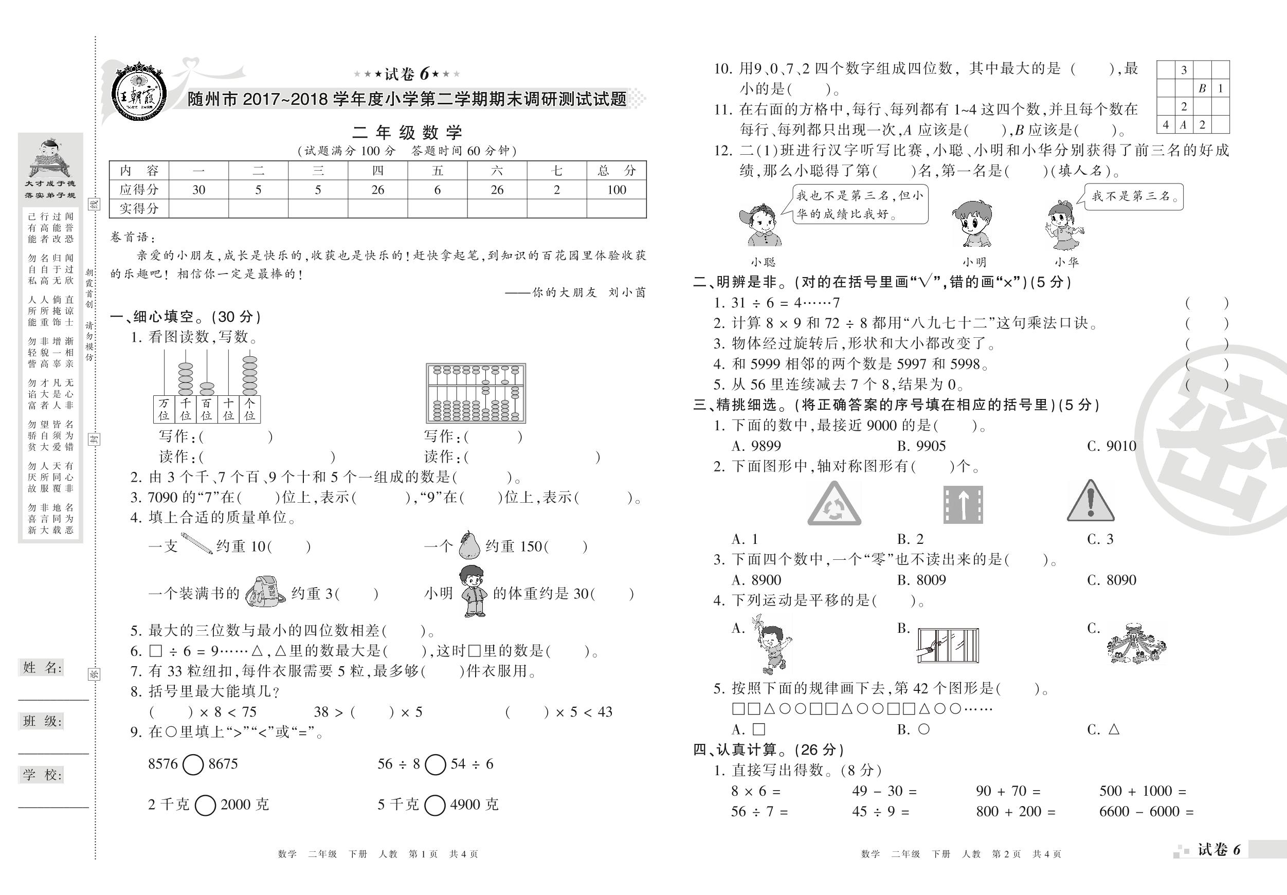 2017-2018学年第二学期随州市二年级数学试卷(人教版)【6】