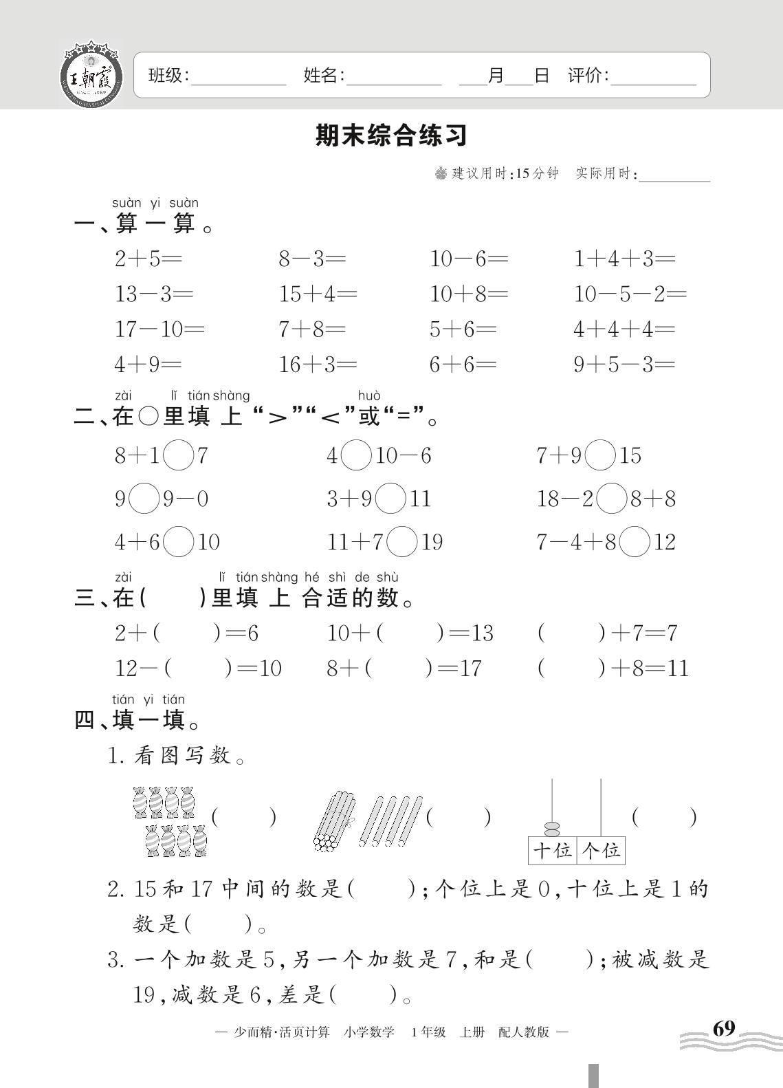 2023上册一年级数学人教版 期末综合练习(计算专练)
