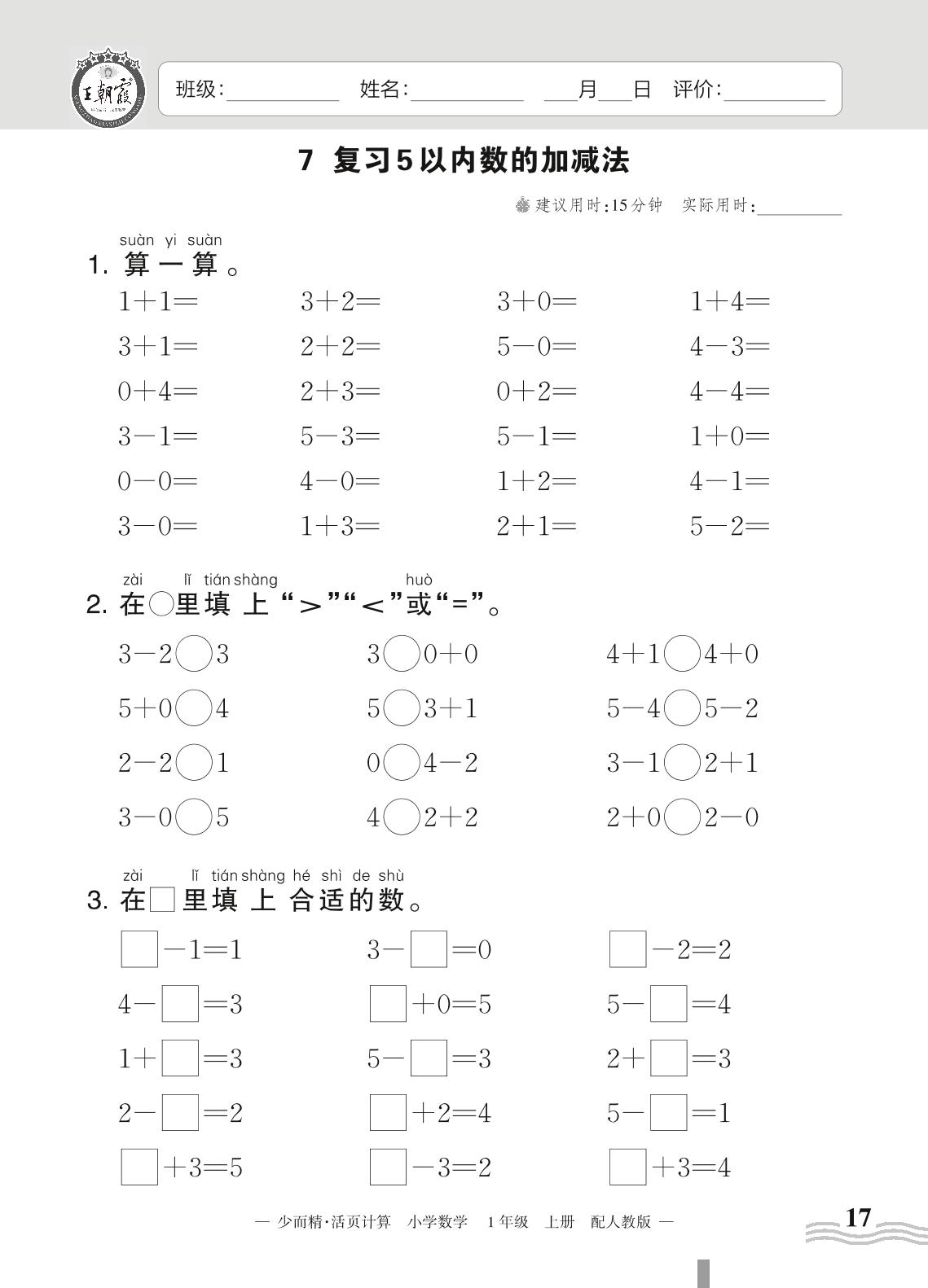 2023上册一年级数学人教版 三 5以内数的认识和加减法——7 复习5以内数的加减法