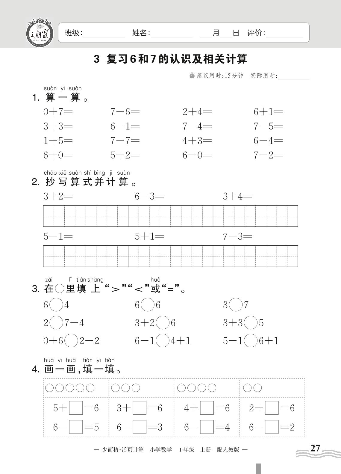 2023上册一年级数学人教版 五 6~10的认识和加减法——3 复习6和7的认识及相关计算