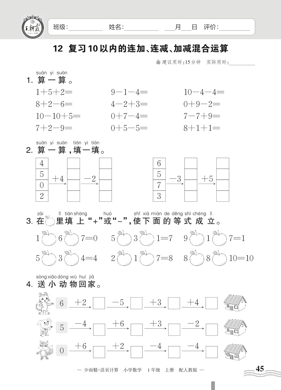 2023上册一年级数学人教版 五 6~10的认识和加减法——12 复习10以内的连加、连减、加减混合运算
