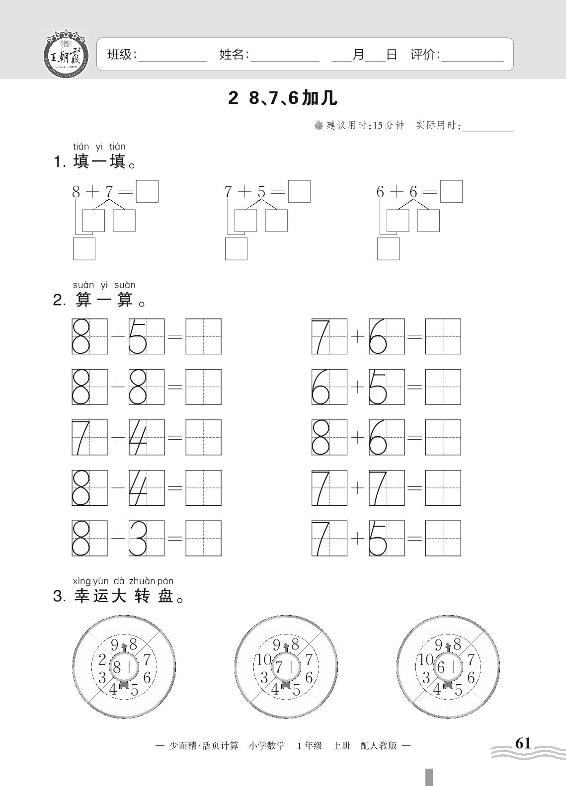 2023上册一年级数学人教版 八 20以内的进位加法——2 8、7、6加几