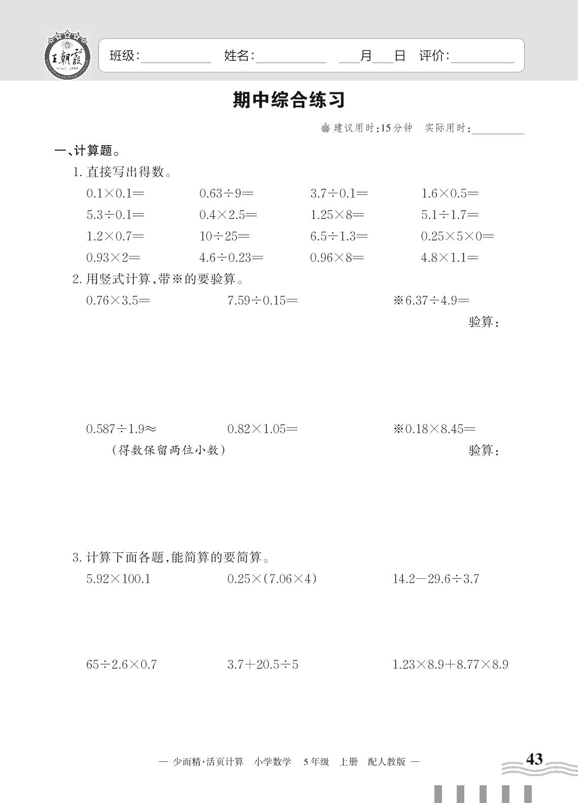 2023上册五年级数学人教版 期中综合练习(计算专练)
