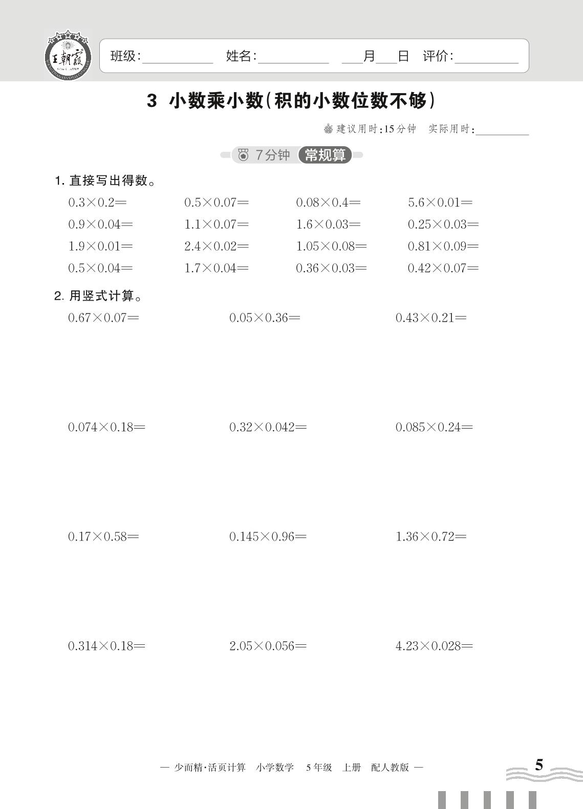 2023上册五年级数学人教版 一 小数乘法——3 小数乘小数(积的小数位数不够)