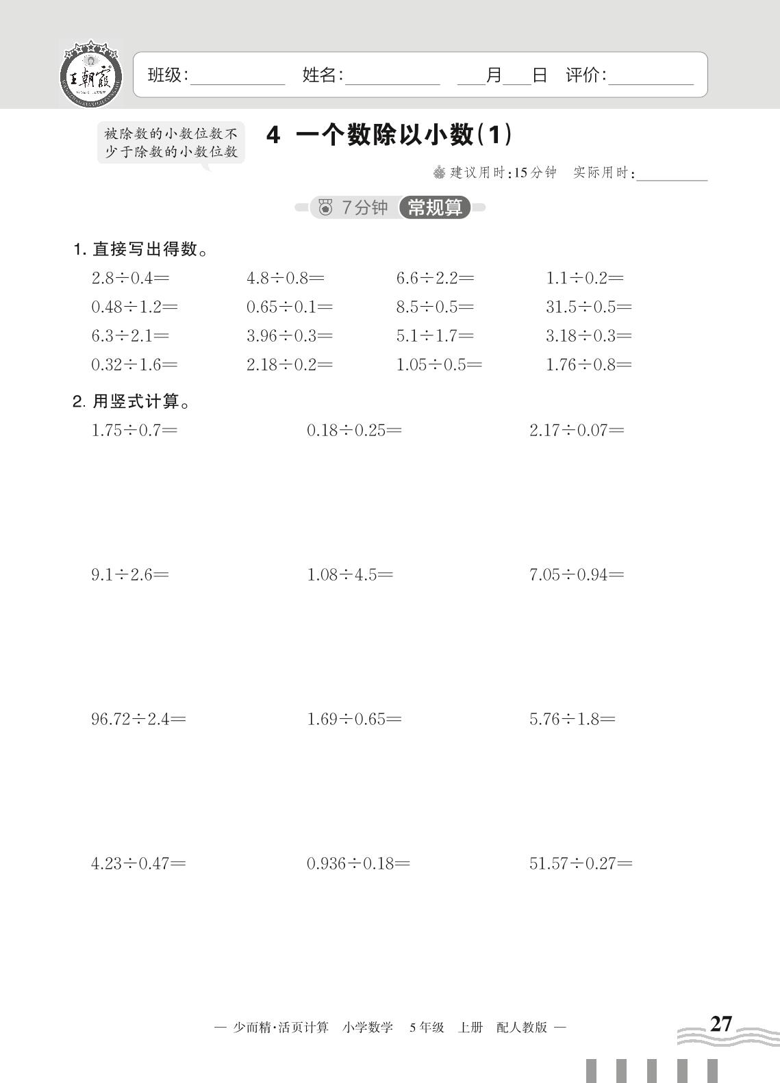 2023上册五年级数学人教版 三 小数除法——4 一个数除以小数(1)