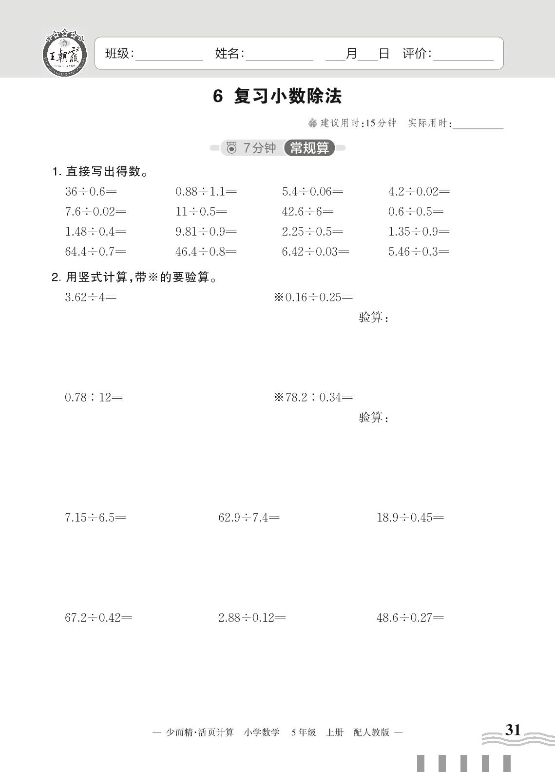 2023上册五年级数学人教版 三 小数除法——6 复习小数除法