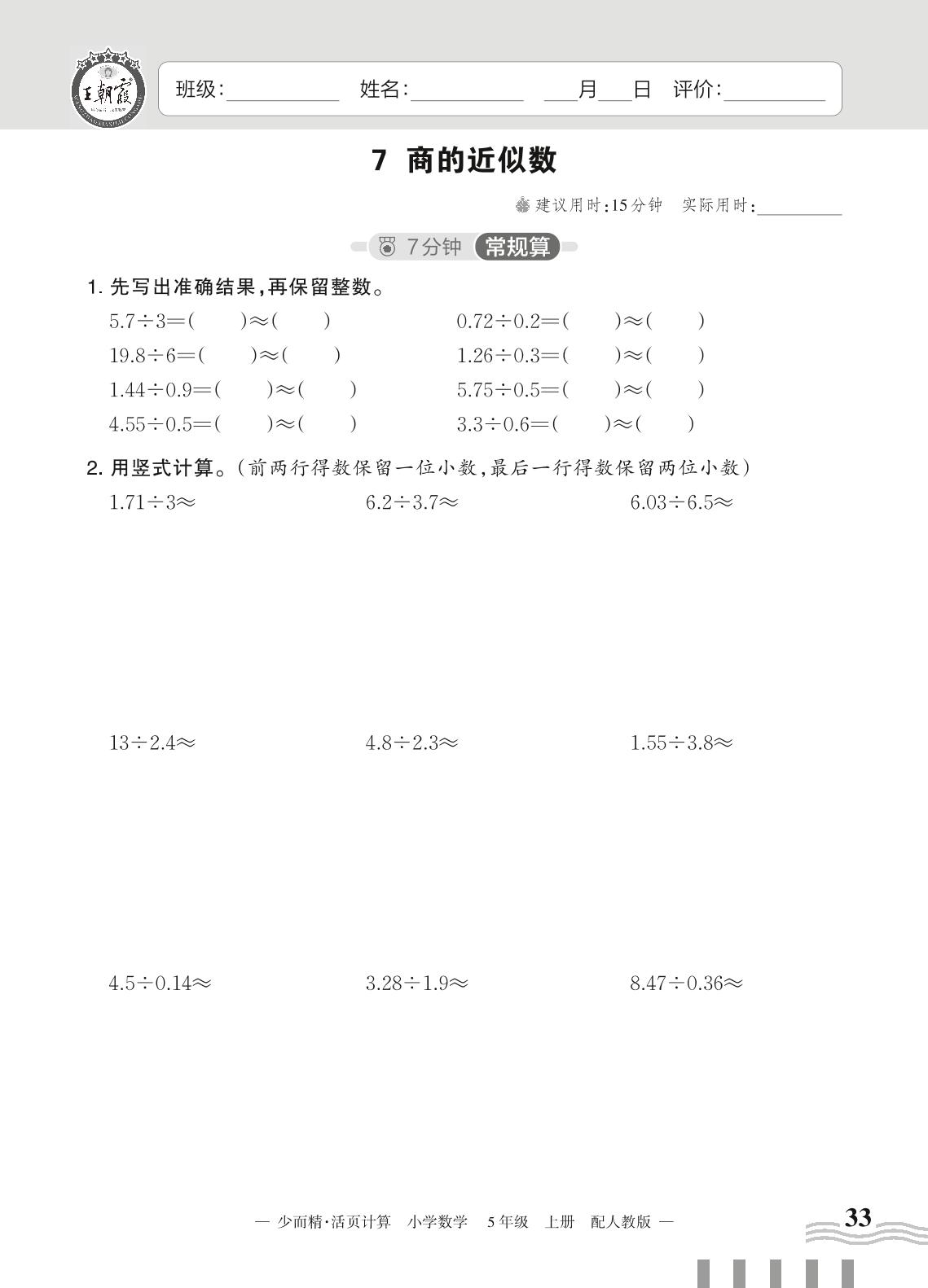 2023上册五年级数学人教版 三 小数除法——7 商的近似数