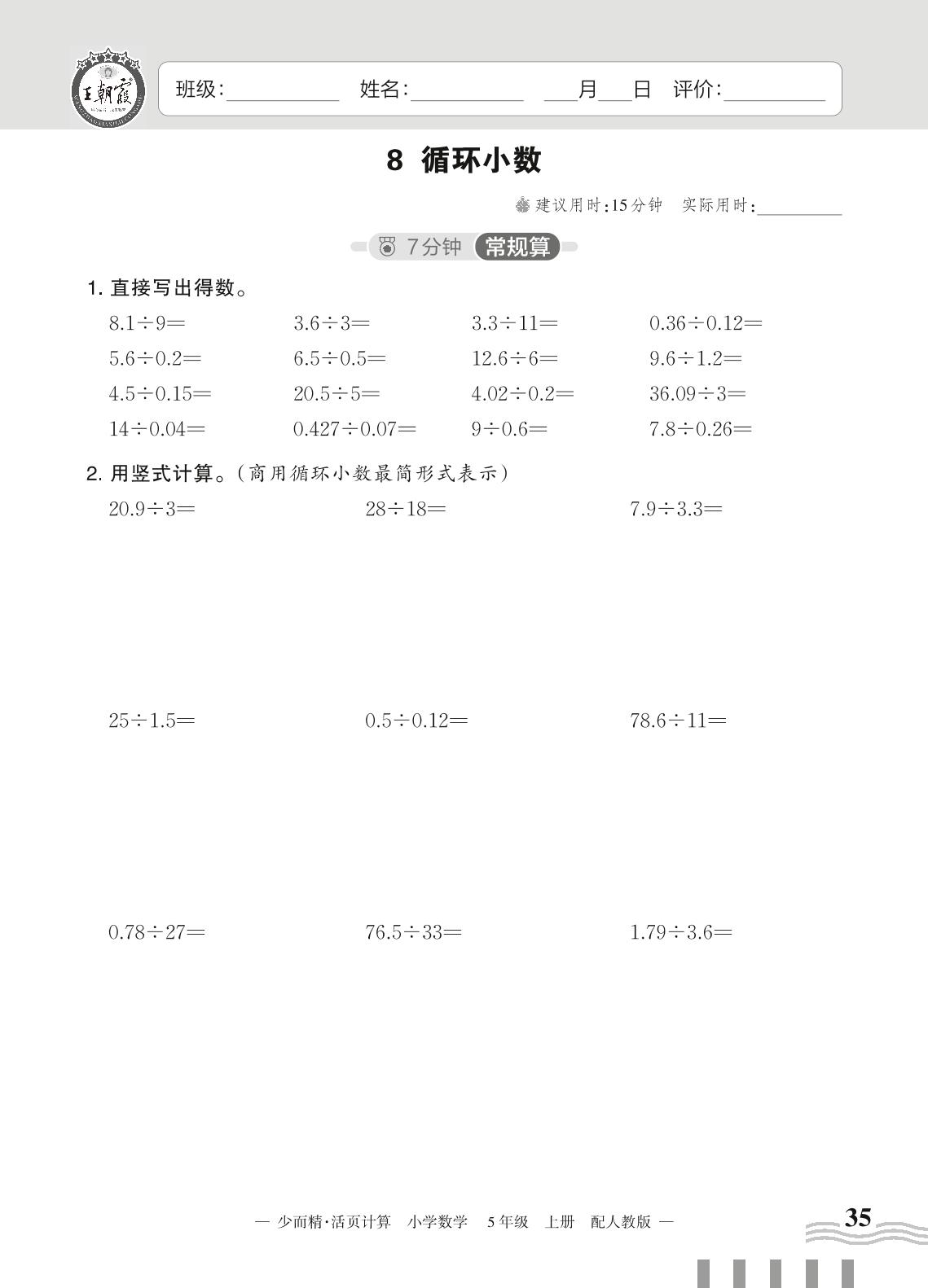 2023上册五年级数学人教版 三 小数除法——8 循环小数