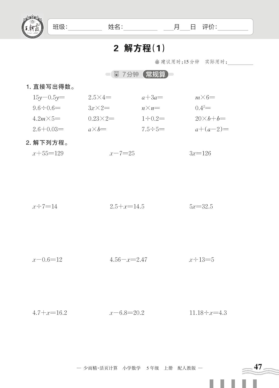 2023上册五年级数学人教版 五 简易方程——2 解方程(1)
